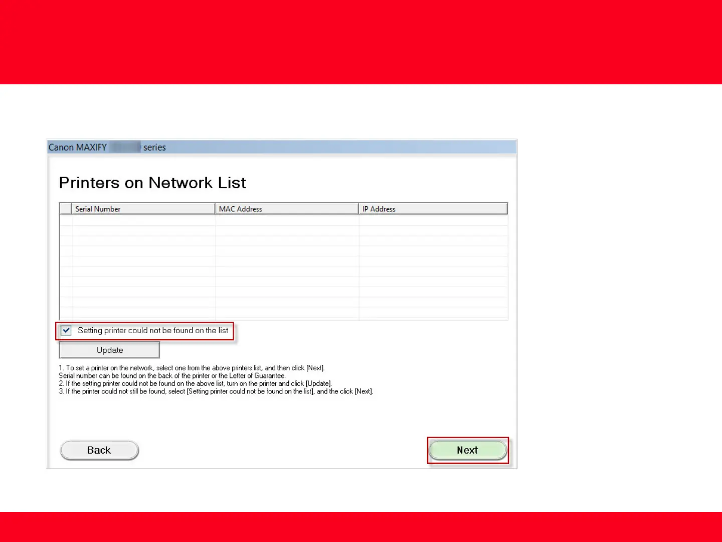 Continue following on-screen instructions. On the Printers on Network List screen, check the Setting printer could not be found on the