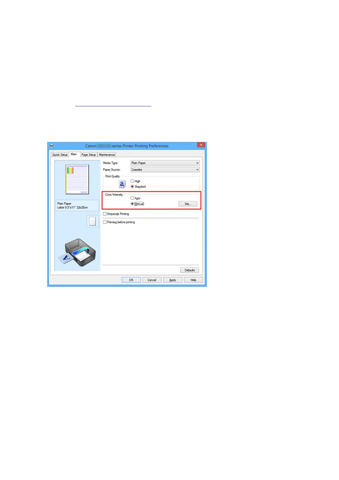 On the Main tab, select Manual for Color/Intensity, and click Set....