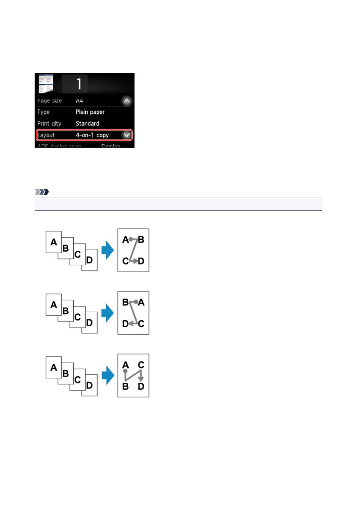 When you select 4-on-1 copy for Layout in Copy, you can copy four original pages onto a single sheet of