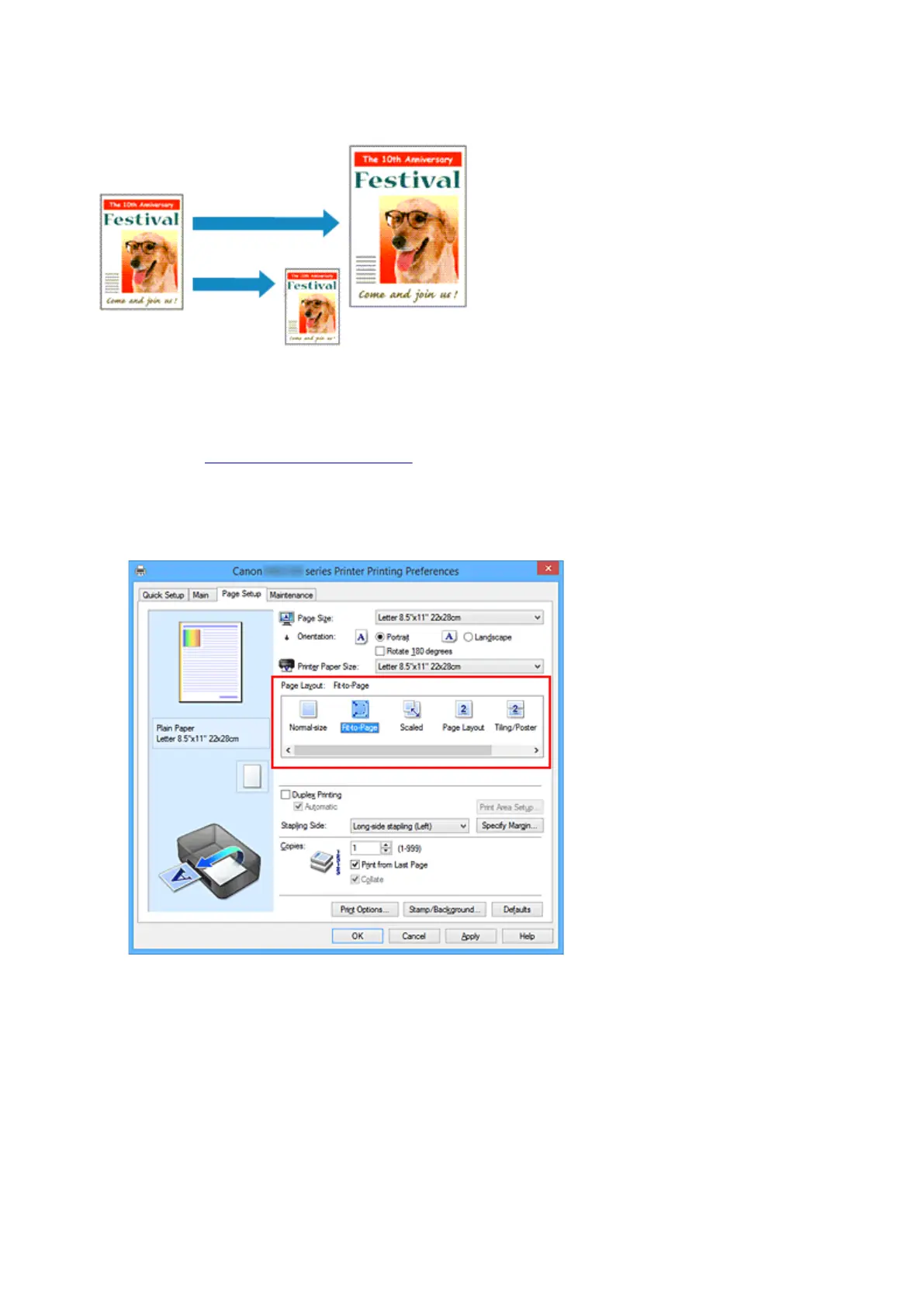 The procedure for printing a document that is automatically enlarged or reduced to fit the page size to be