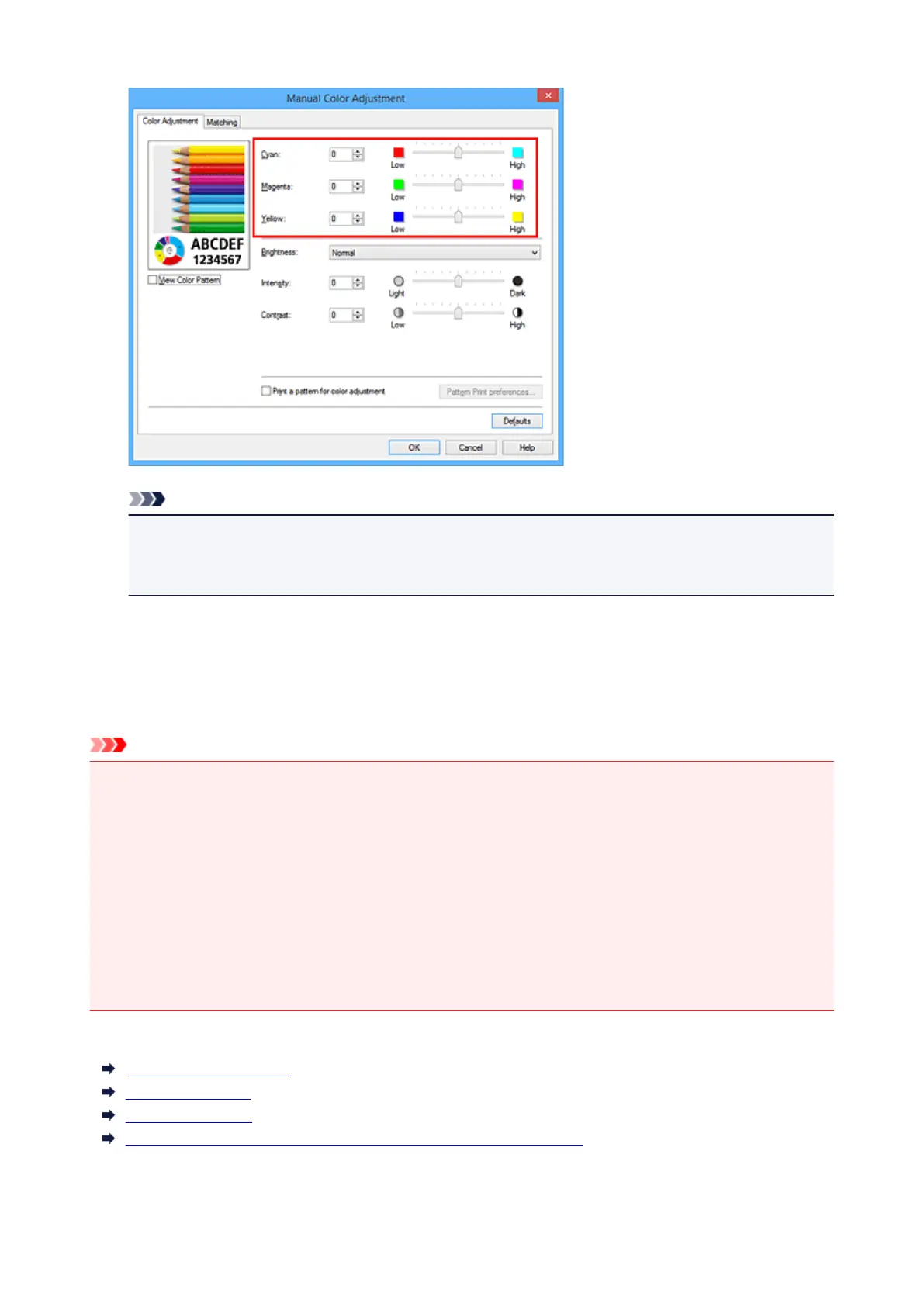 • When Print a pattern for color adjustment is selected on the Color Adjustment tab, the following