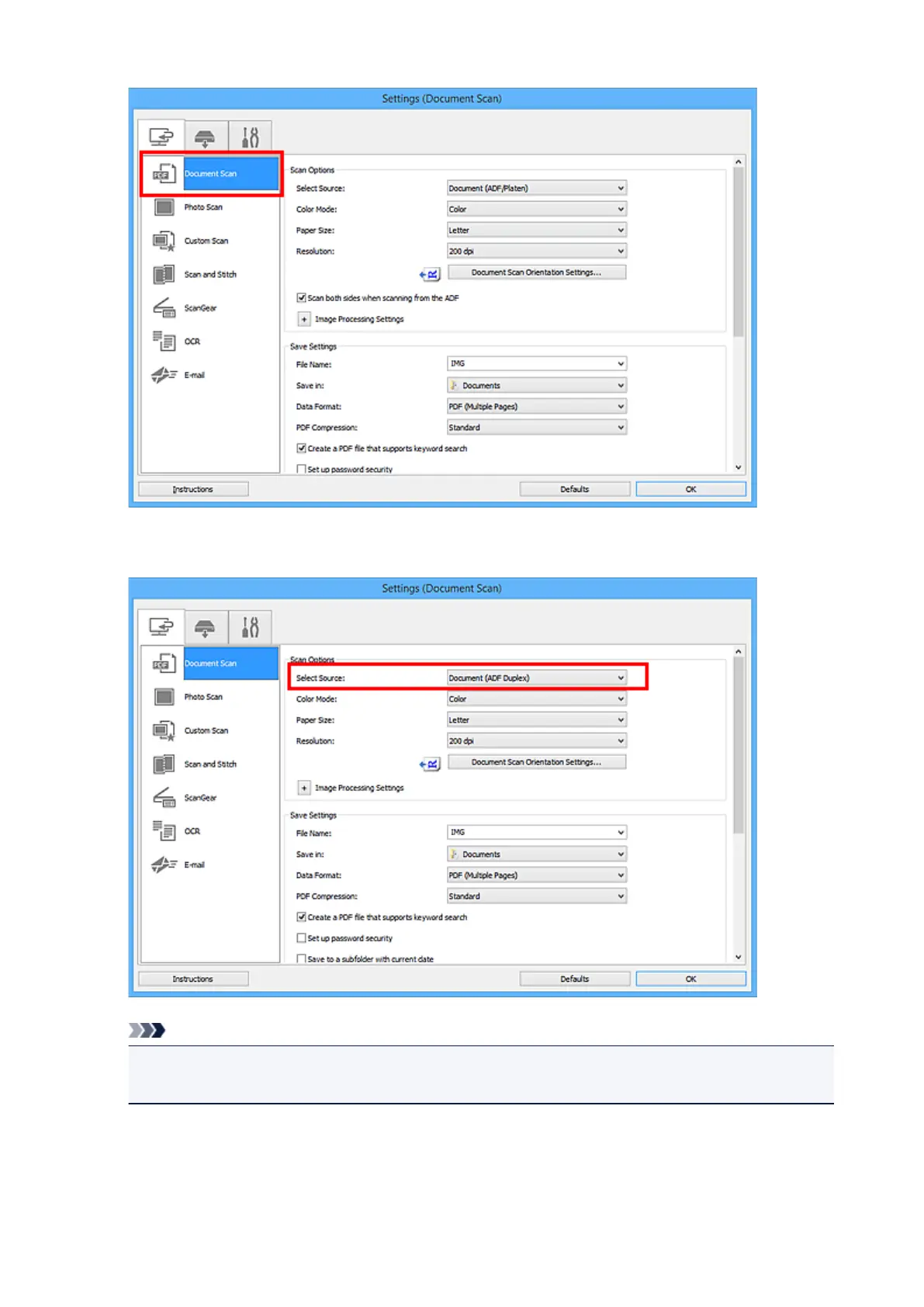 Select Document (ADF/Platen) or Document (ADF Duplex) for Select Source.