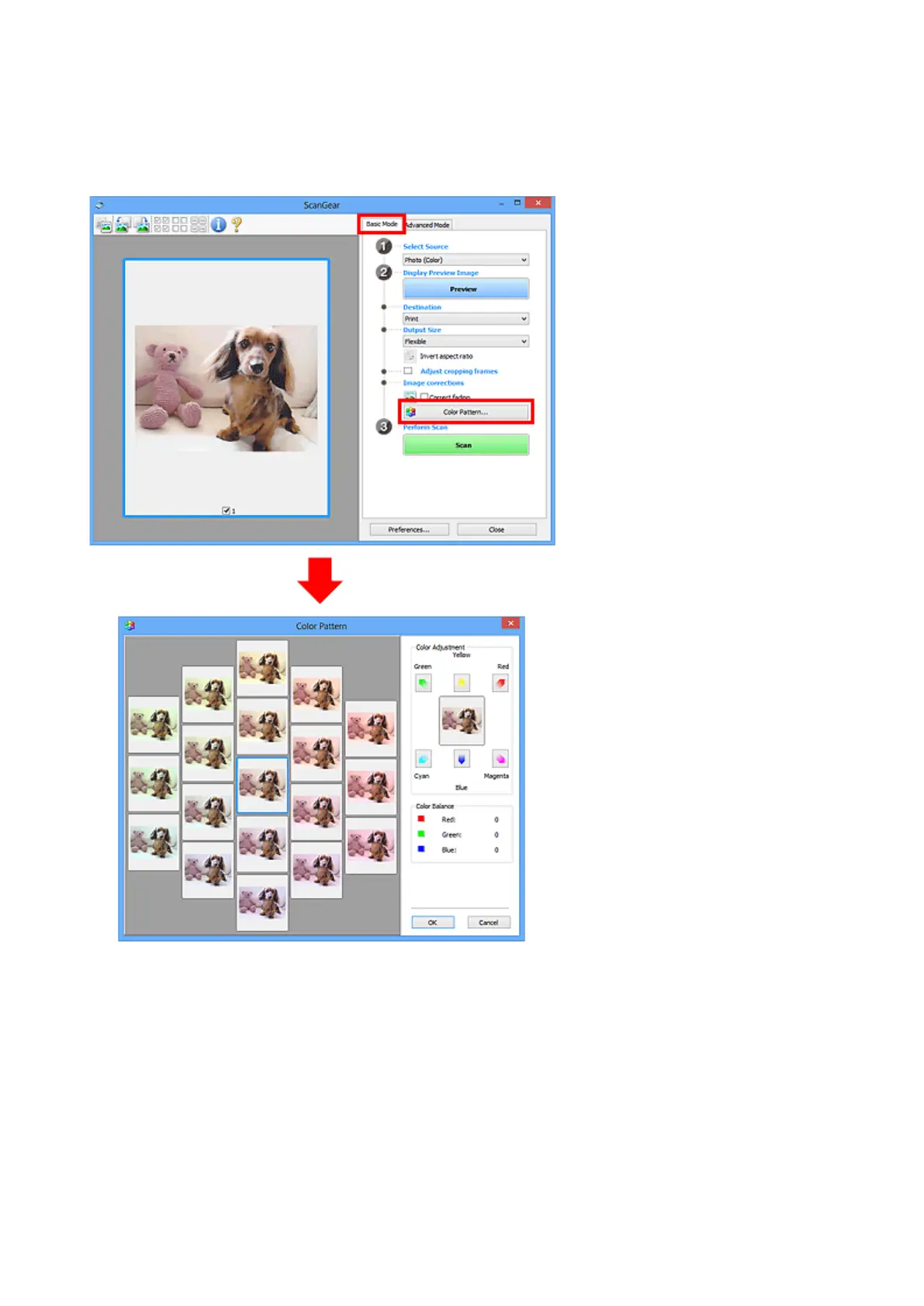 You can preview color changes and reproduce natural colors by using the color pattern function in ScanGear
