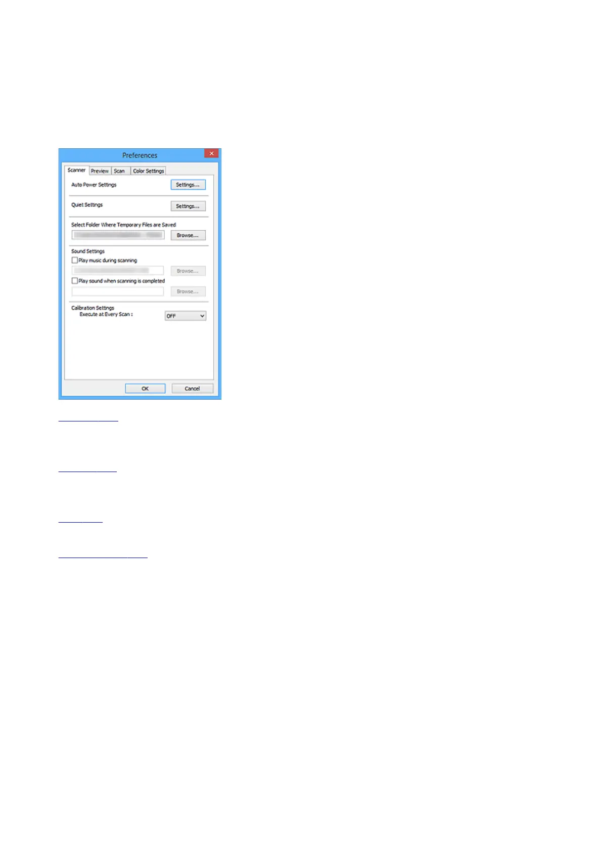 In the Preferences dialog box, you can make advanced settings to ScanGear (scanner driver) functions via