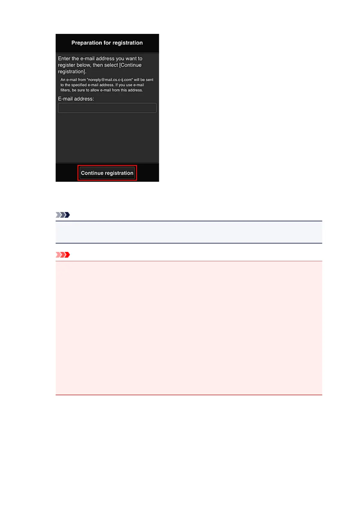 In the displayed screen, enter the E-mail address that you want to register, and then select Continue