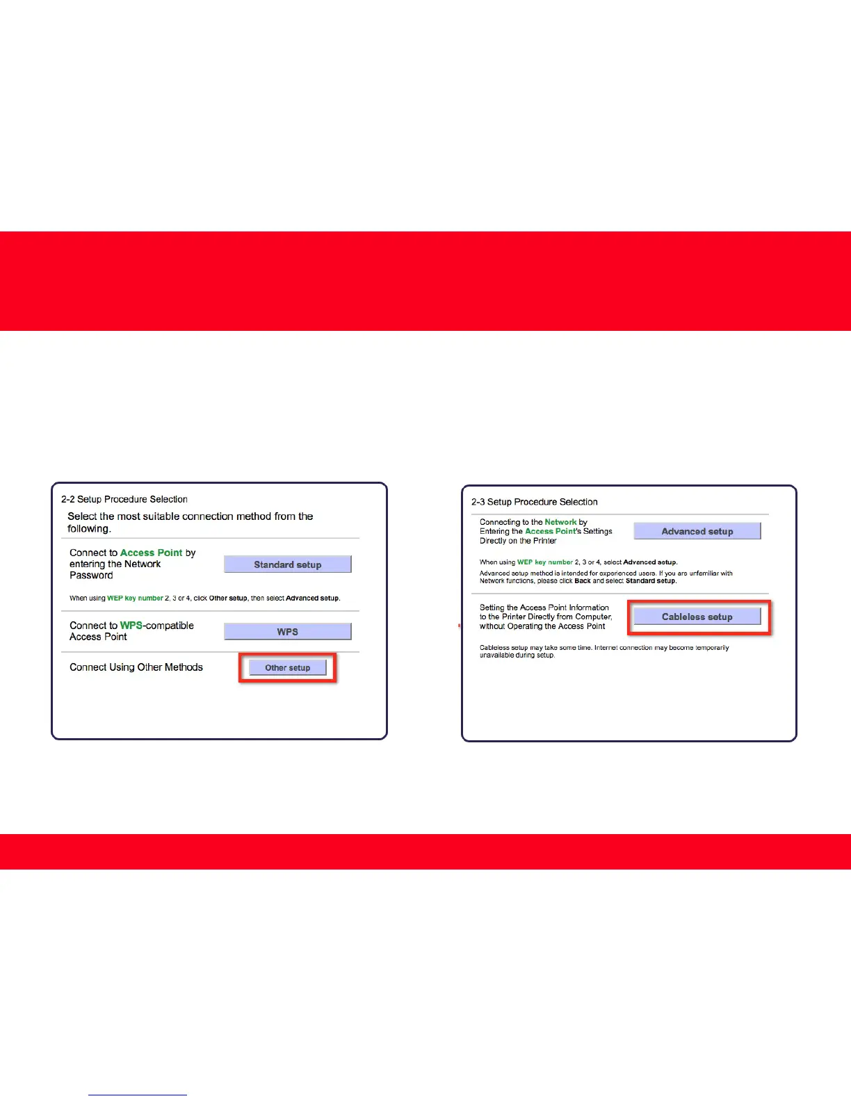 Select Other setup on the Setup Procedure Selection screen (2-2) and Cableless setup on the Setup Procedure Selection screen (2-3).
