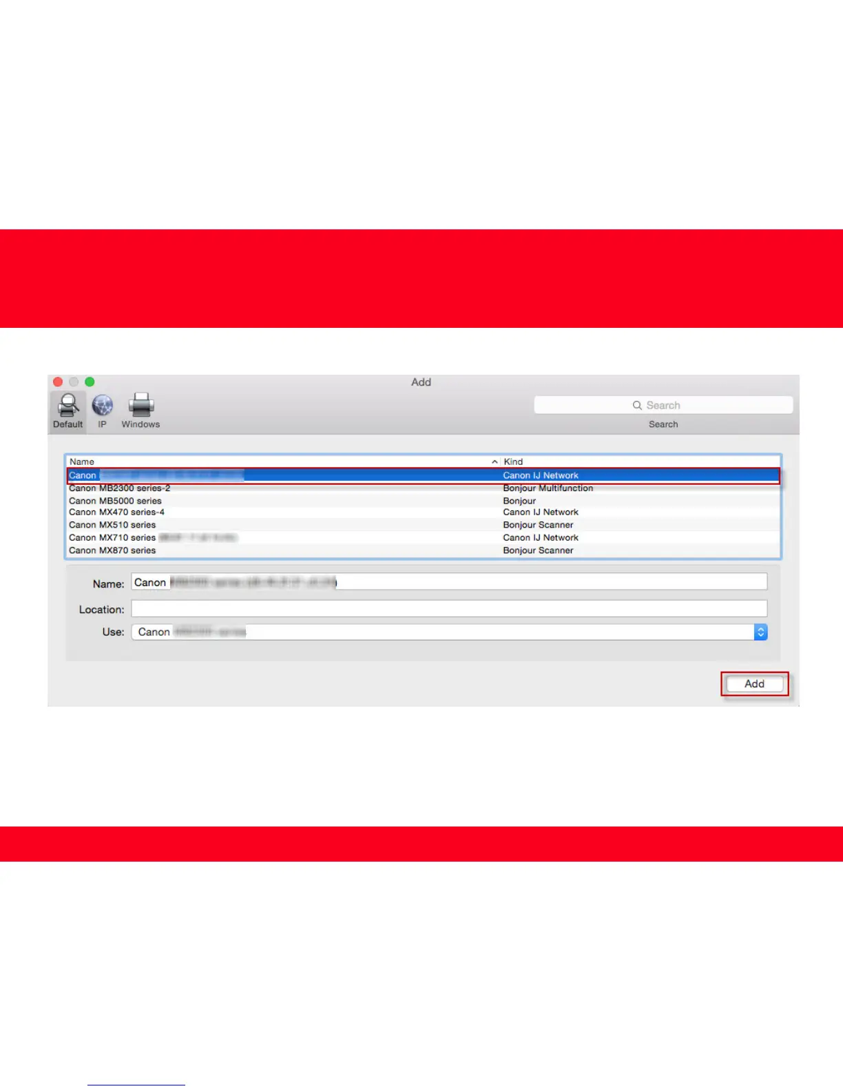 Select the Canon MB5300 series with Canon IJ Network listed in the Kind column, then click Add.