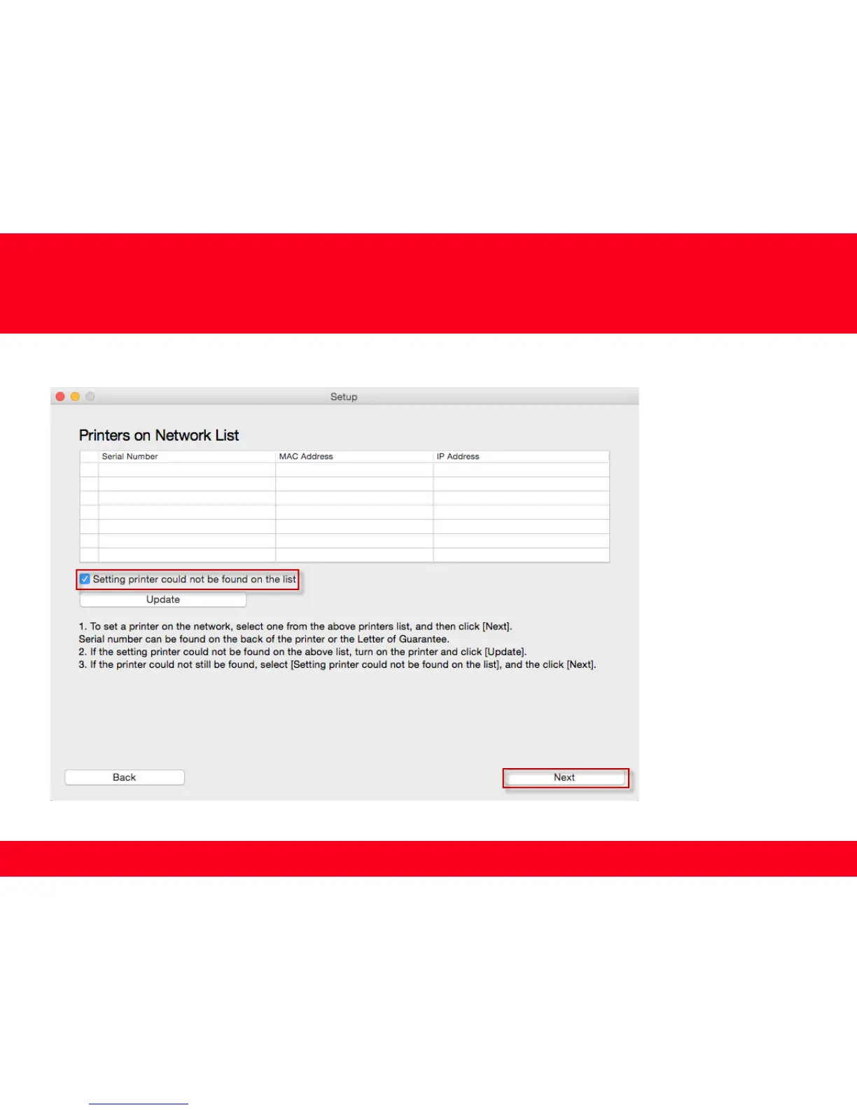 Continue following on-screen instructions. On the Printers on Network List, check the Setting printer could not be found on the list