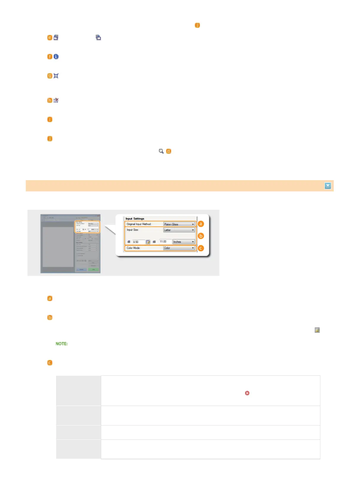 Displays the current settings of the scanned image, such as the color mode and size of the scan area.