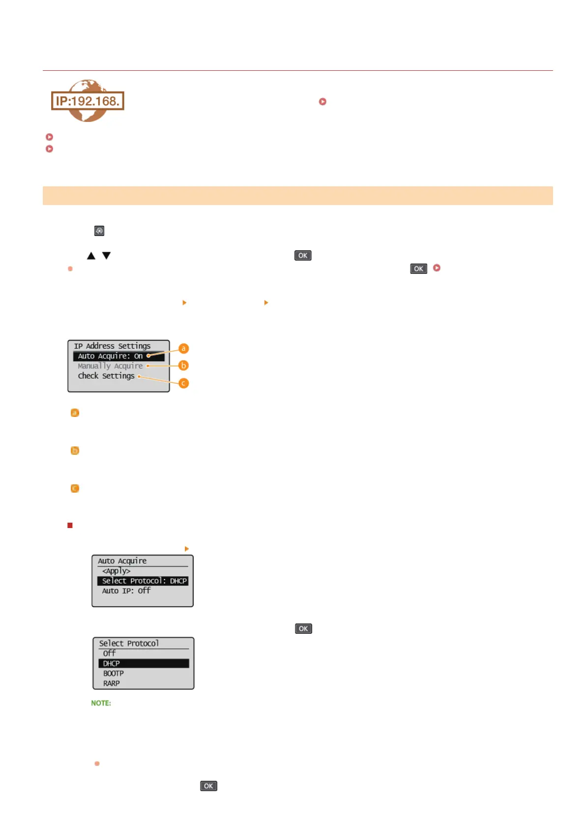 Select to automatically assign an IP address via a protocol such as DHCP. When <Auto Acquire: On> is displayed, automatic