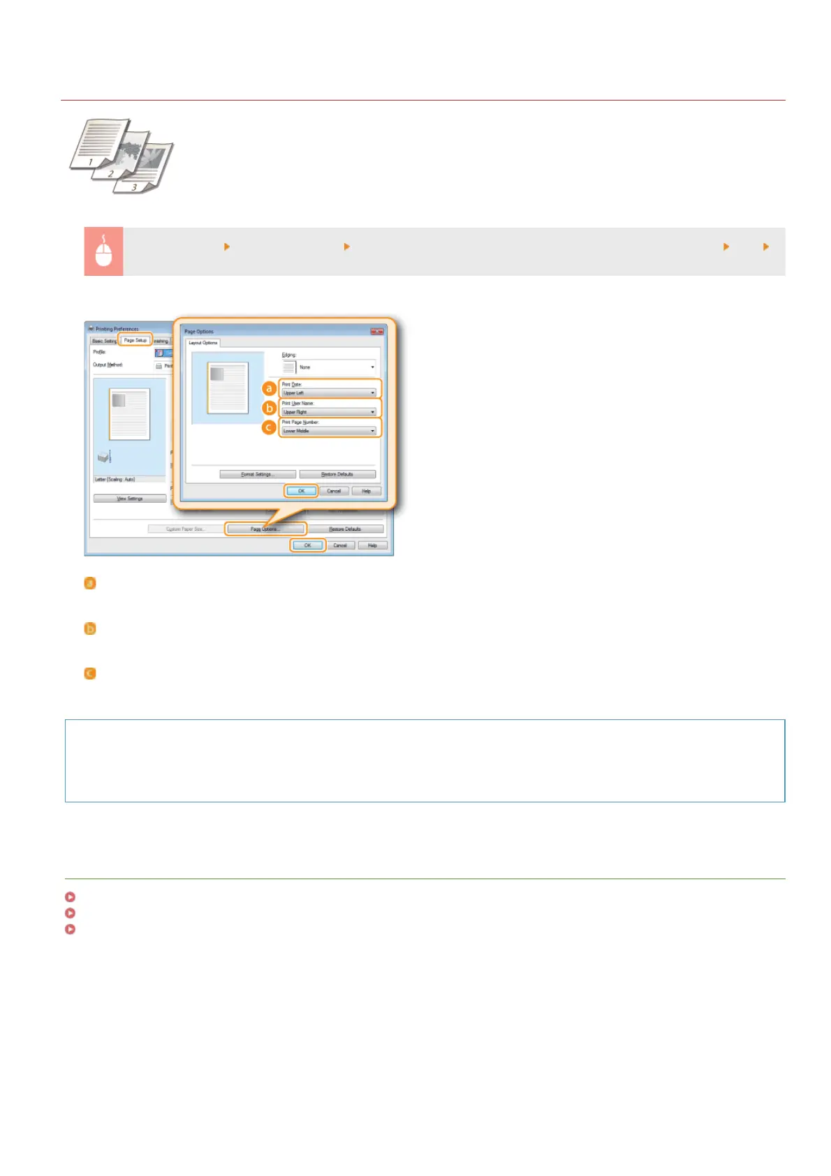 Click [Page Options] Select the print position of the print date, user name or page number [OK]