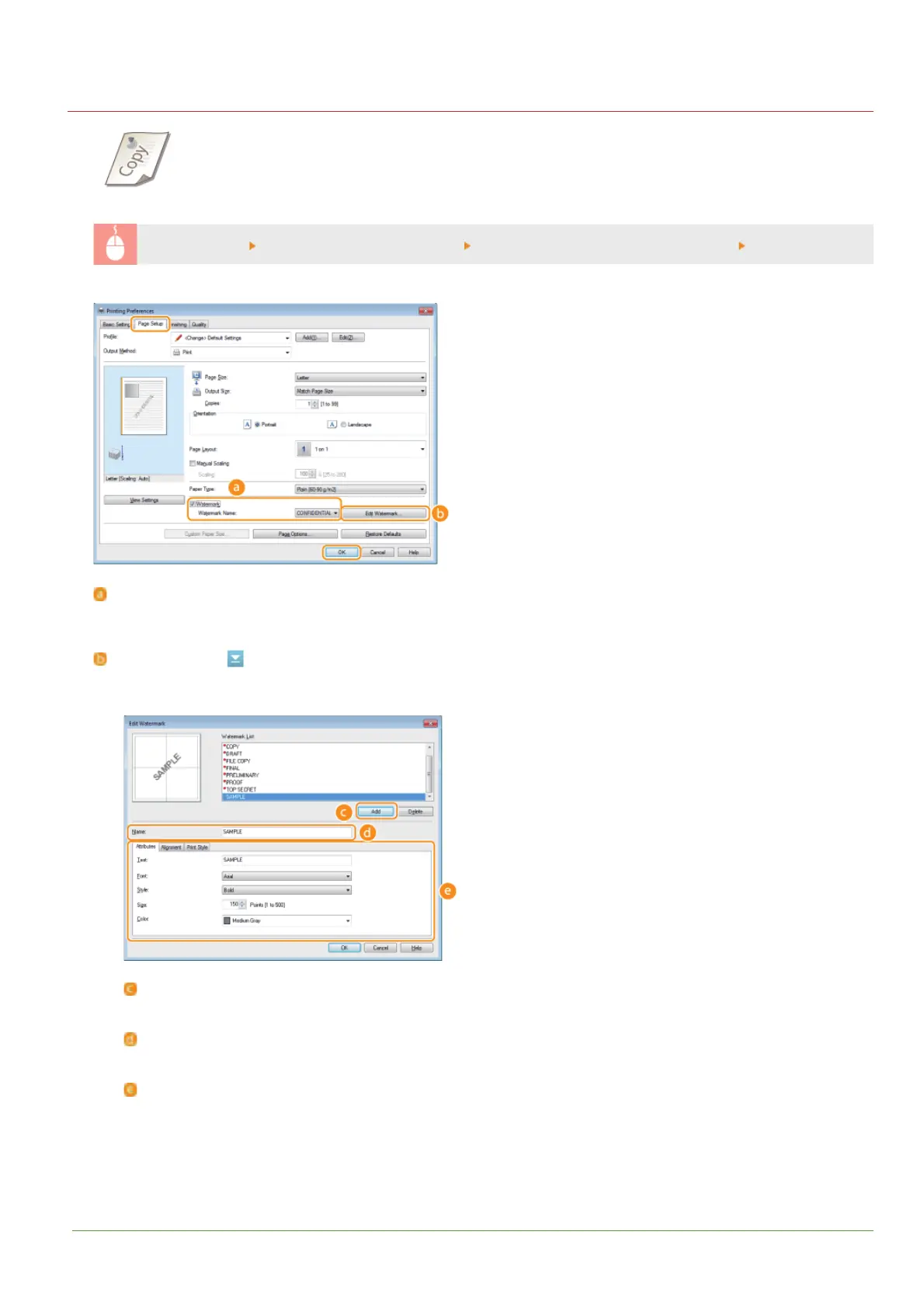 Click each tab to specify the text, color, or print position of the watermark. For more information, click [Help] on the