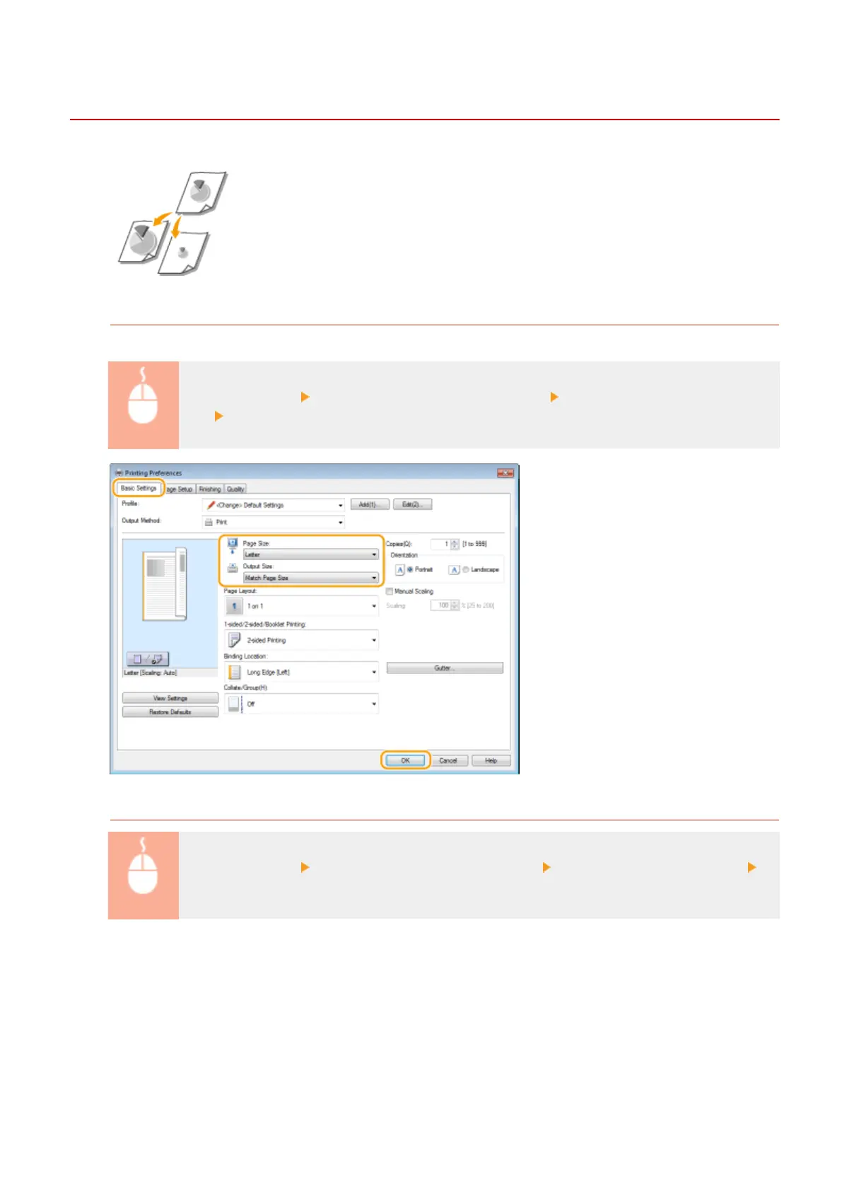 [Basic Settings] tab Select the document size in [Page Size] Select the paper size in [Output