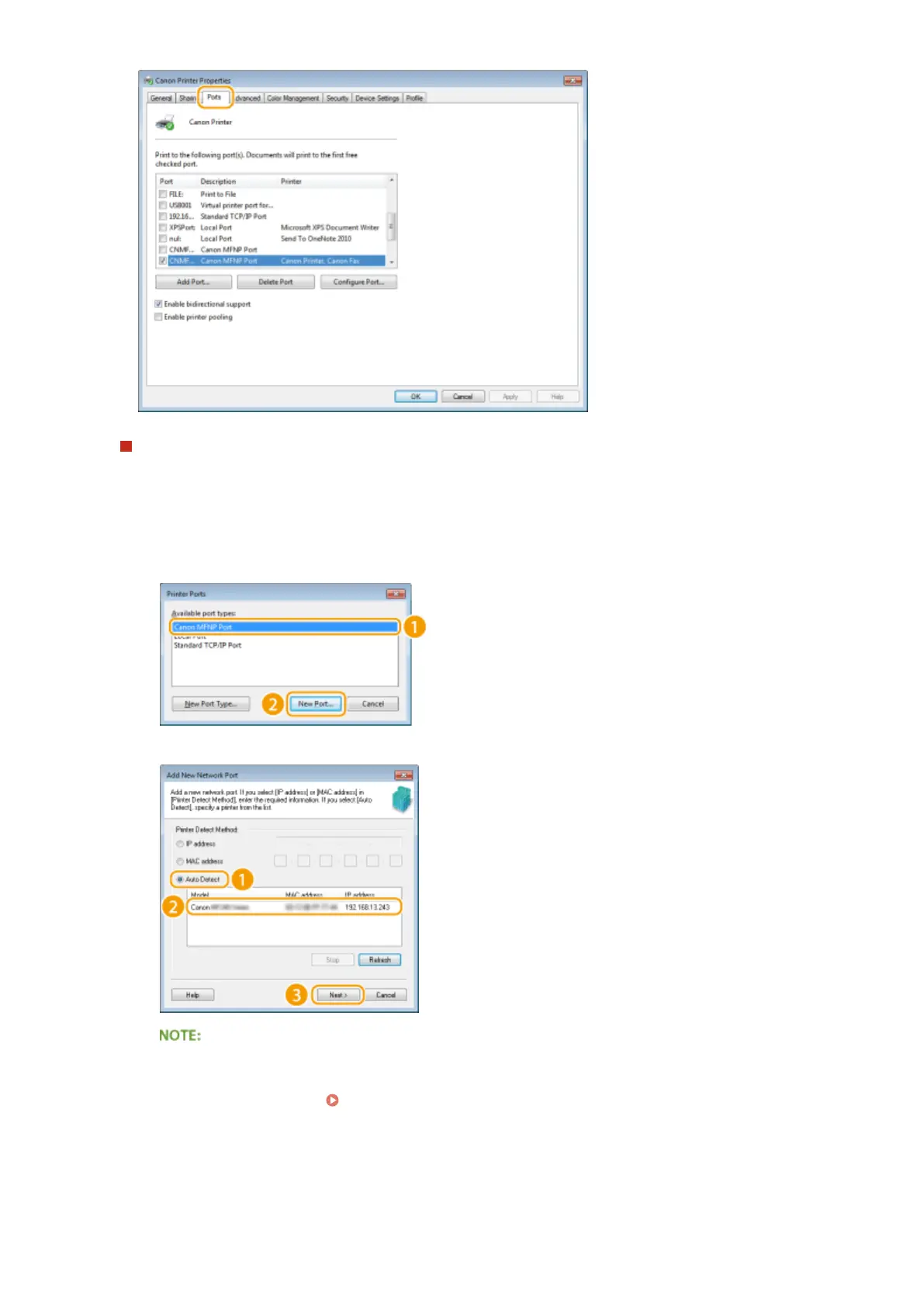 Select [Canon MFNP Port] in [Available port types] and click [New Port].