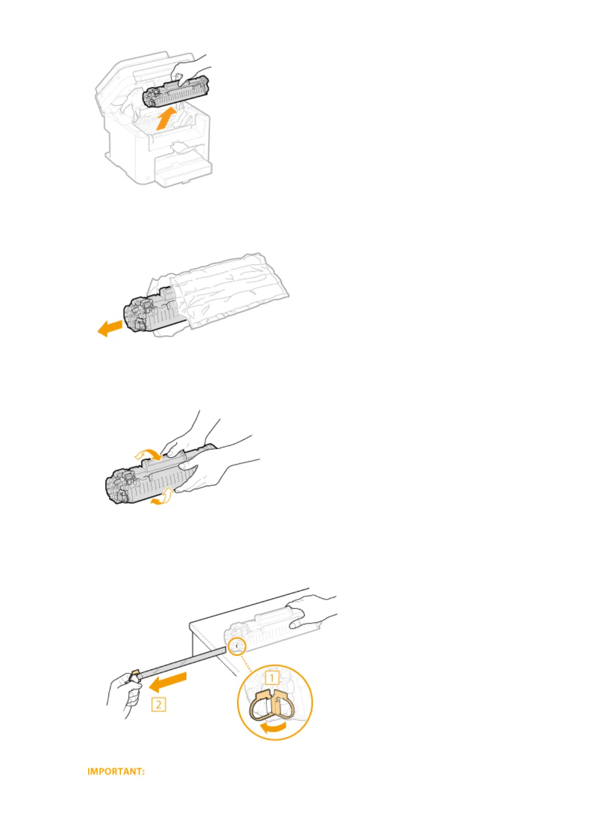 Shake the toner cartridge 5 or 6 times as shown below to evenly distribute the toner
