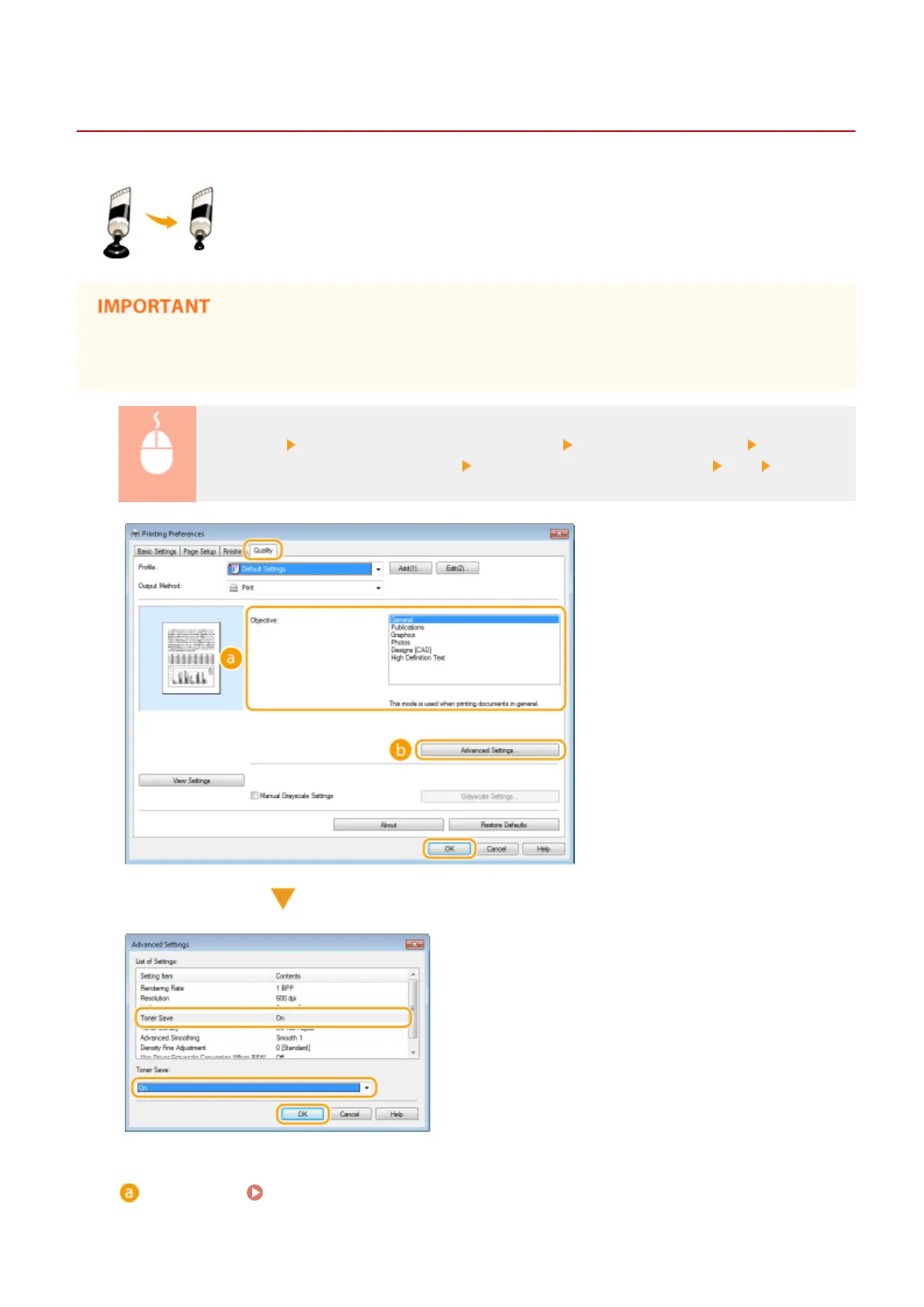 [Quality] tab Select the document type in [Objective] Click [Advanced Settings] Select [Toner