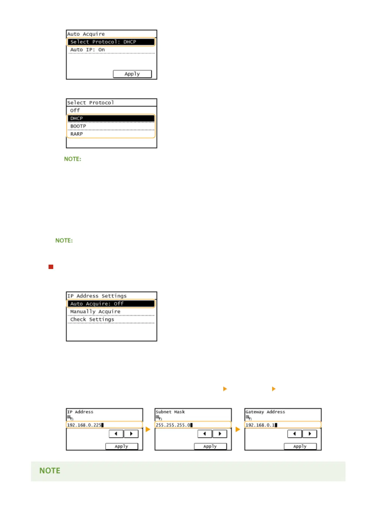Select <Off>. If you select <DHCP>, <BOOTP>, or <RARP> when these services are unavailable, the