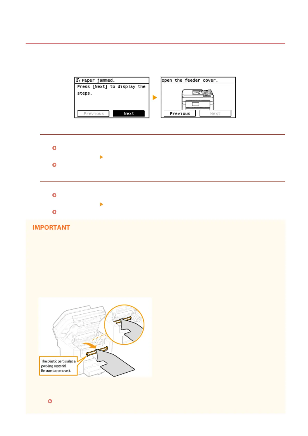 If a paper jams, <Paper jammed.> is displayed on the screen. Tap <Next> to display simple solutions. If it is dicult to
