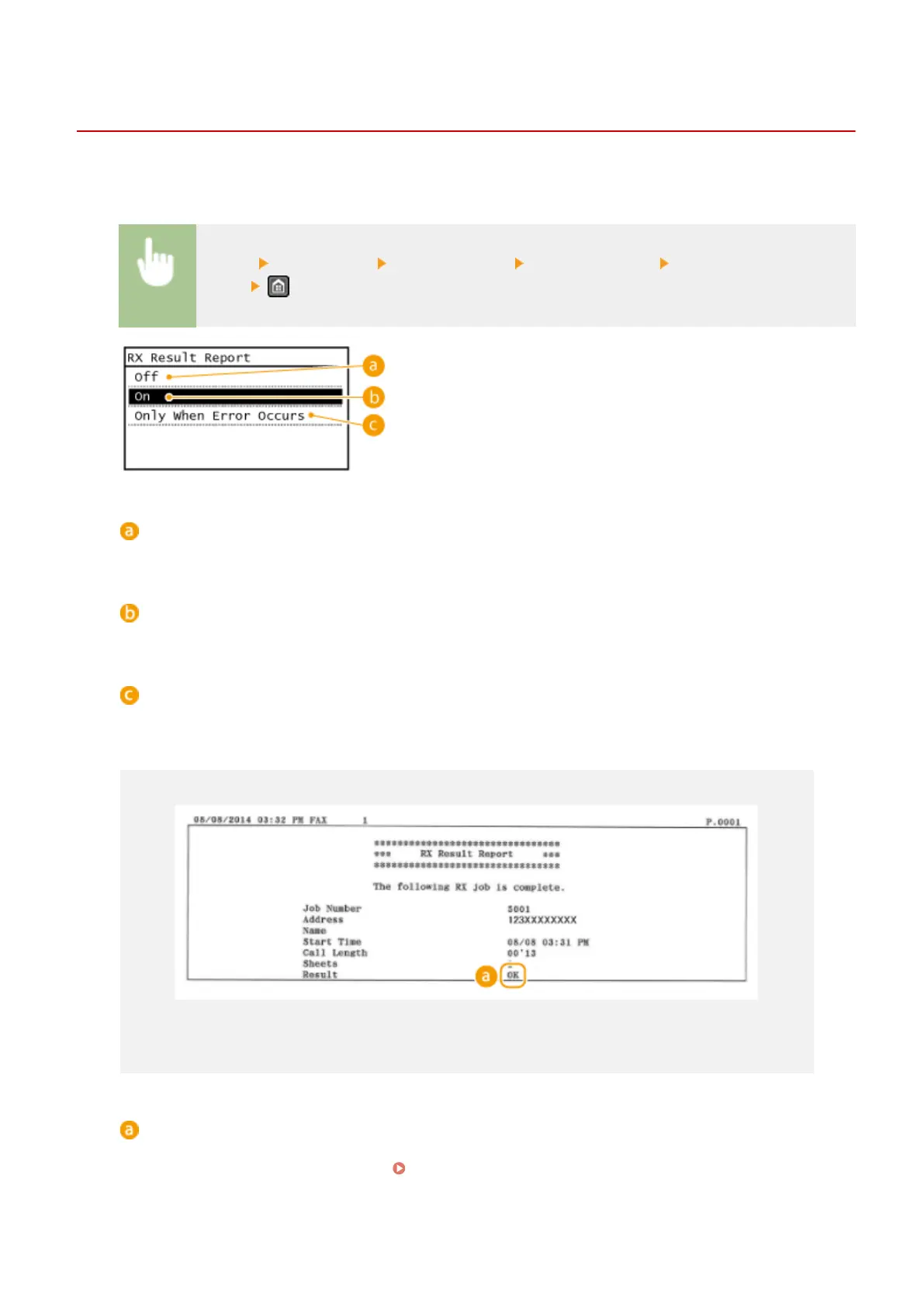 You can check the logs of received fax documents by printing an RX Result Report. The report can be printed either