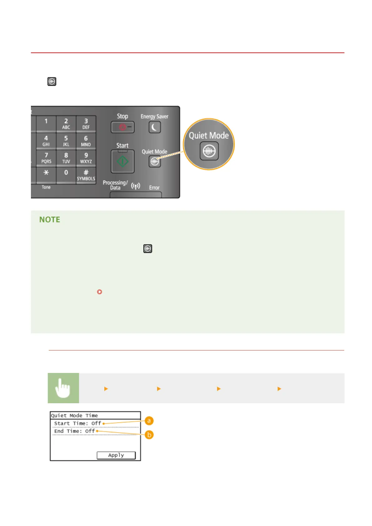 You can specify a time for the machine to enter or exit quiet mode automatically. For example, this is useful