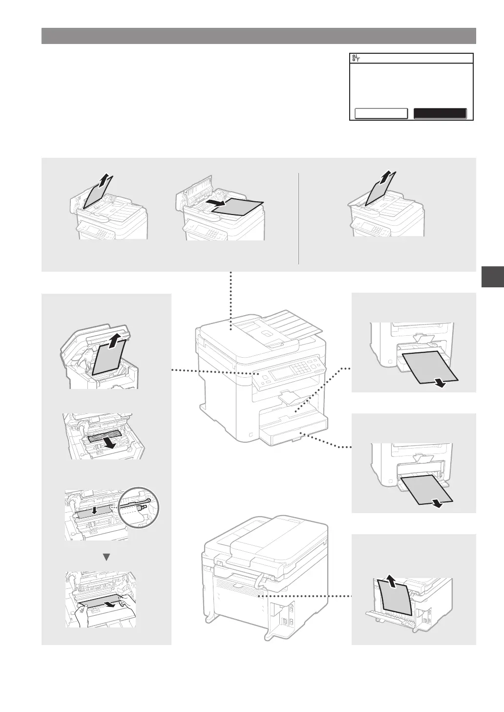 Jos näyttöön tulee seuraava näyttö, syöttölaitteessa tai laitteen sisällä on paperitukos.