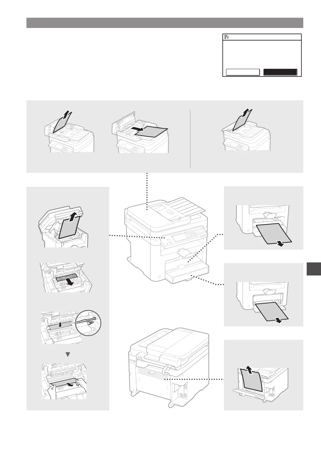 Když se objeví následující obrazovka, došlo kuvíznutí papíru vpodavači nebo uvnitř