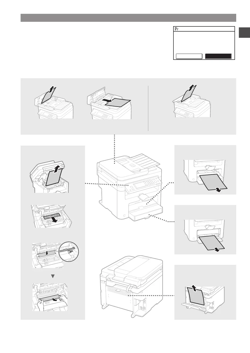 Vorgehensweise, um das gestaute Dokument oder Papier zu entfernen. In dieser