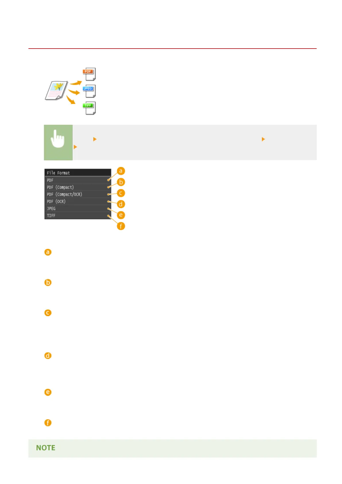 You can select the le format to which documents are scanned, from PDF/JPEG/TIFF.