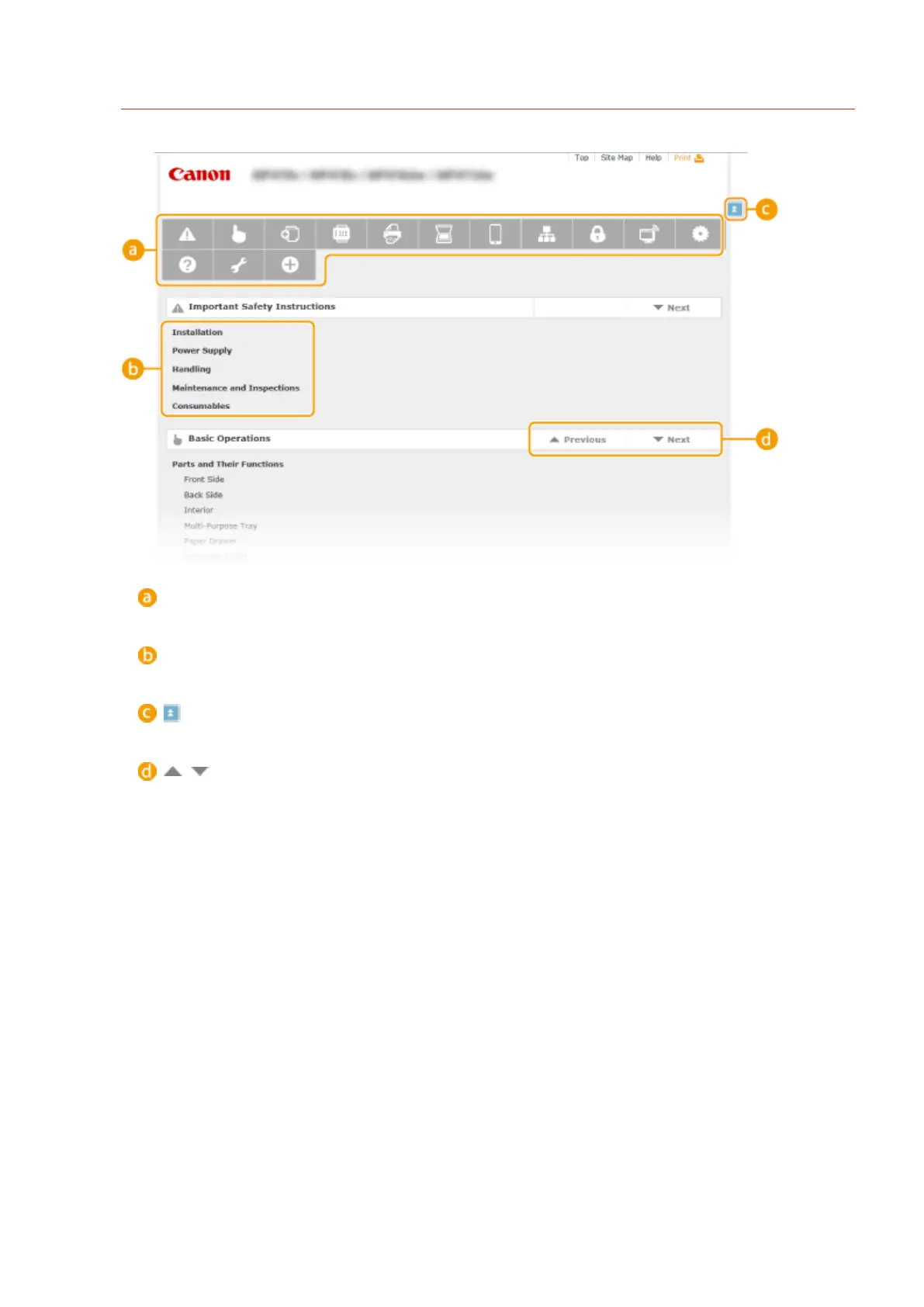 Displays the table of contents for the e-Manual.