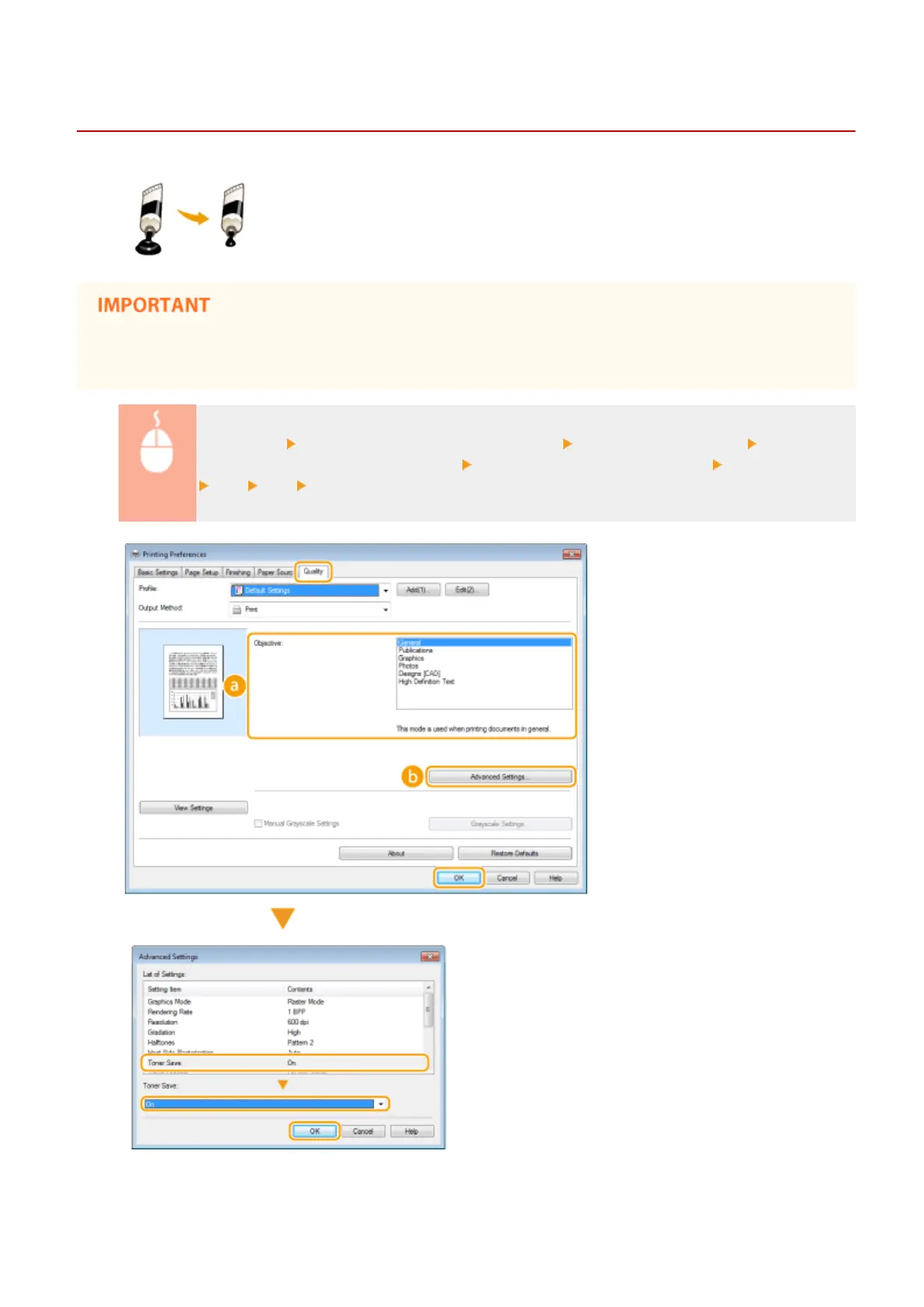 [Quality] tab Select the document type in [Objective] Click [Advanced Settings] Select [Toner