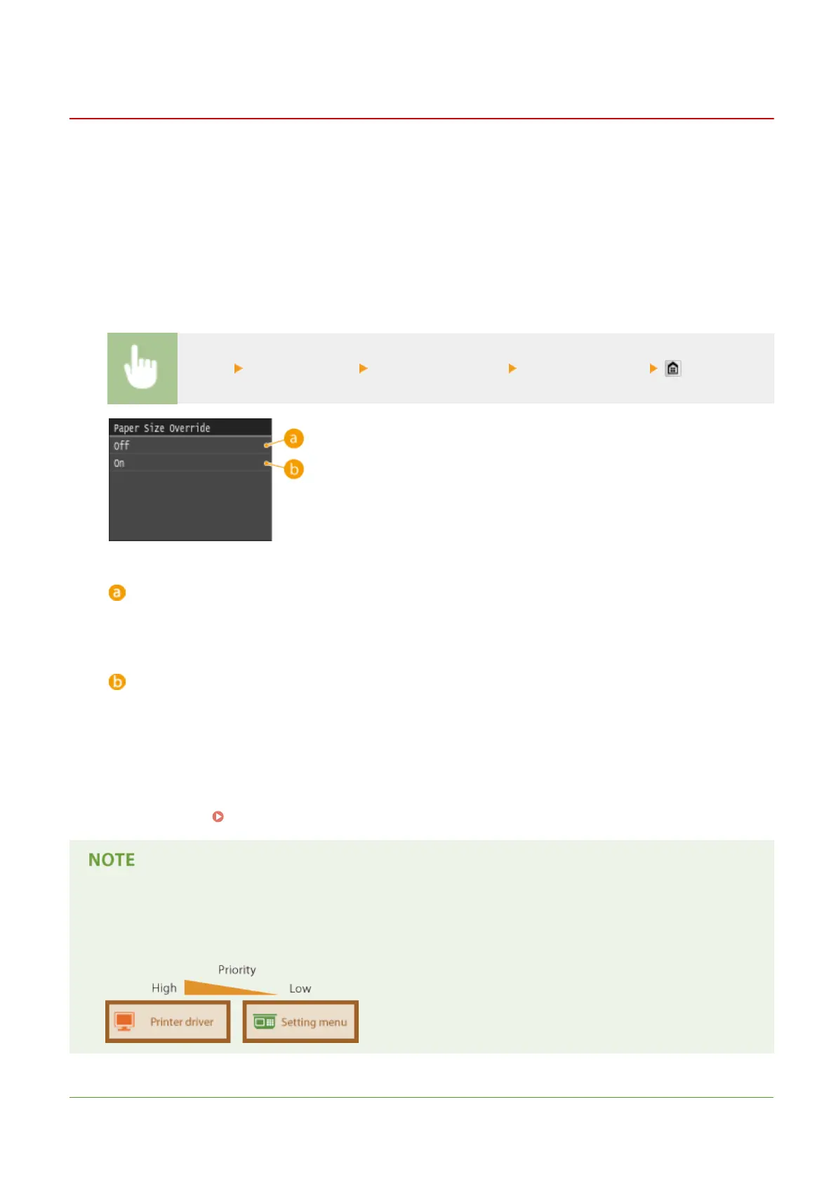 <Menu> <Printer Settings> <Paper Size Override> Select <Off> or <On>