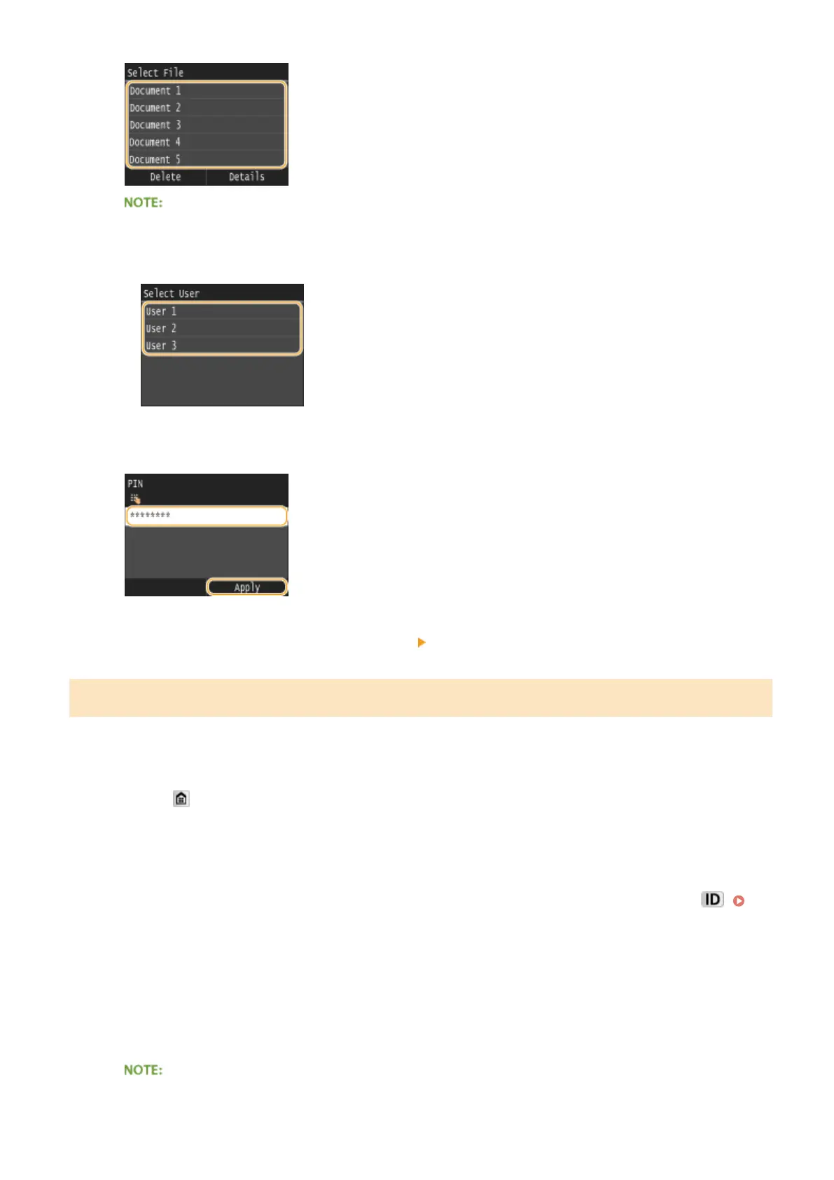 ● If secured documents from two or more users are being held in memory, the <Select User> screen is