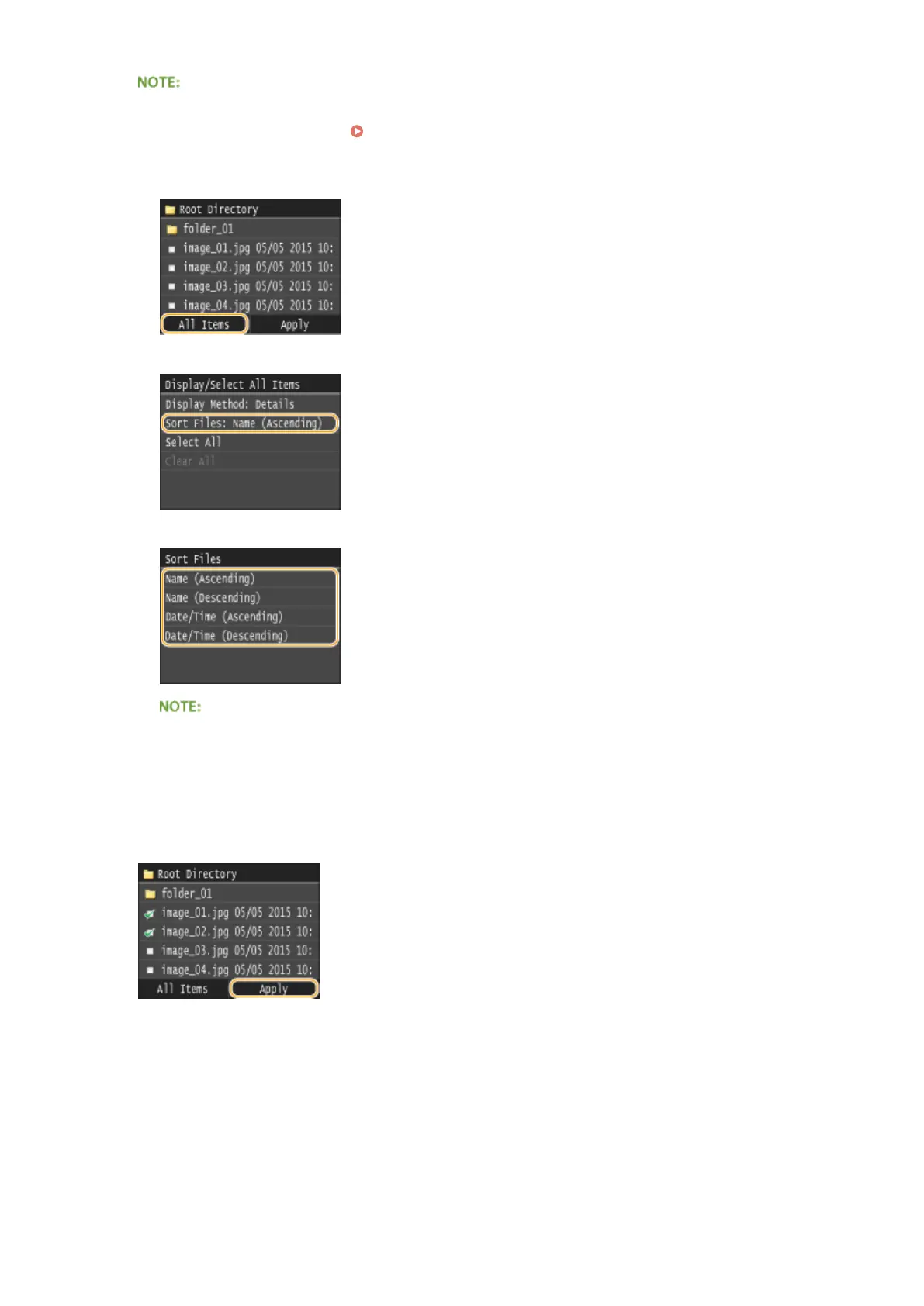 ● When you select <Date/Time (Ascending)> or <Date/Time (Descending)>, les are sorted based on the