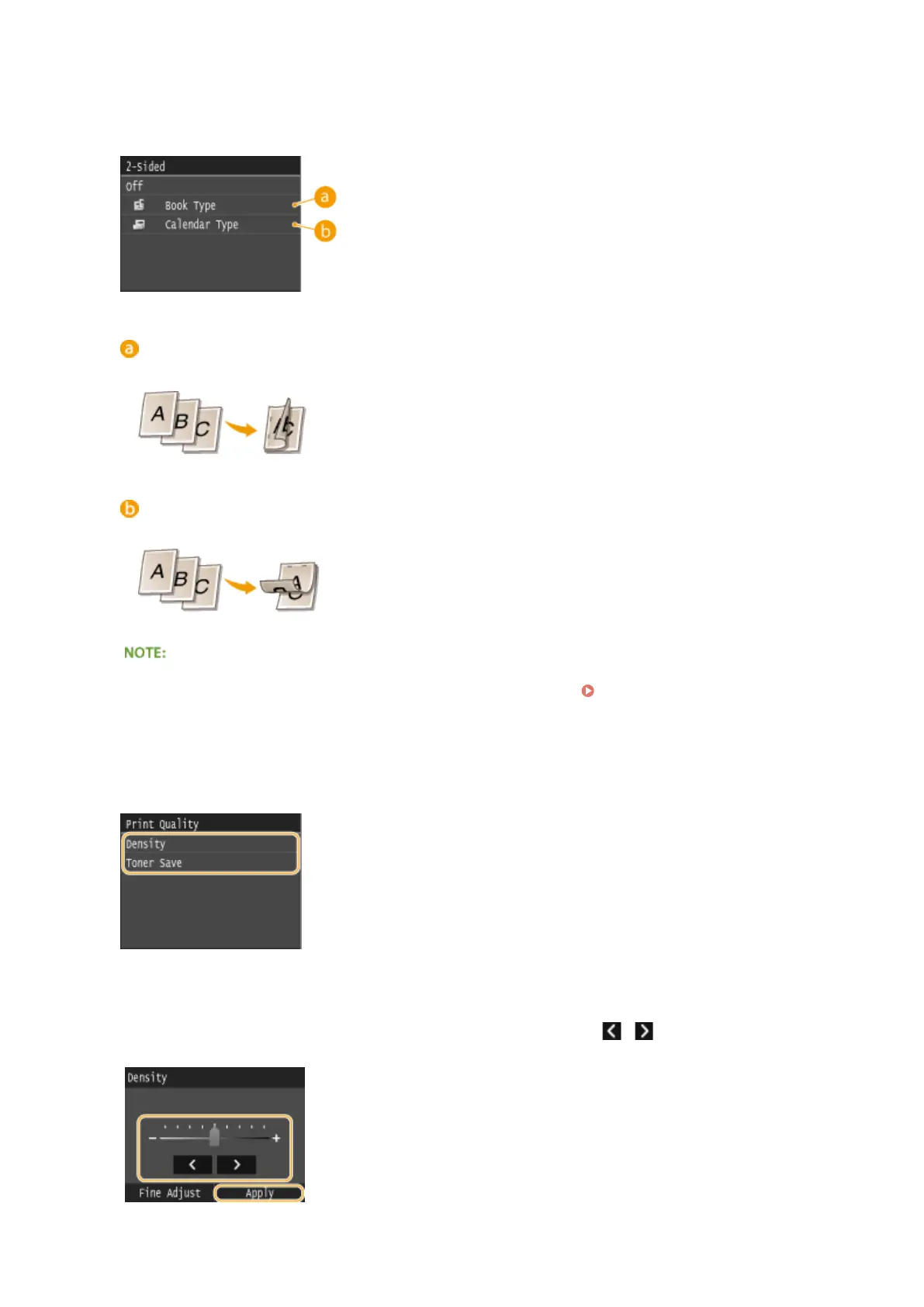 Adjust the toner density to be used for printing. Make adjustment using / , and then tap <Apply>. Note