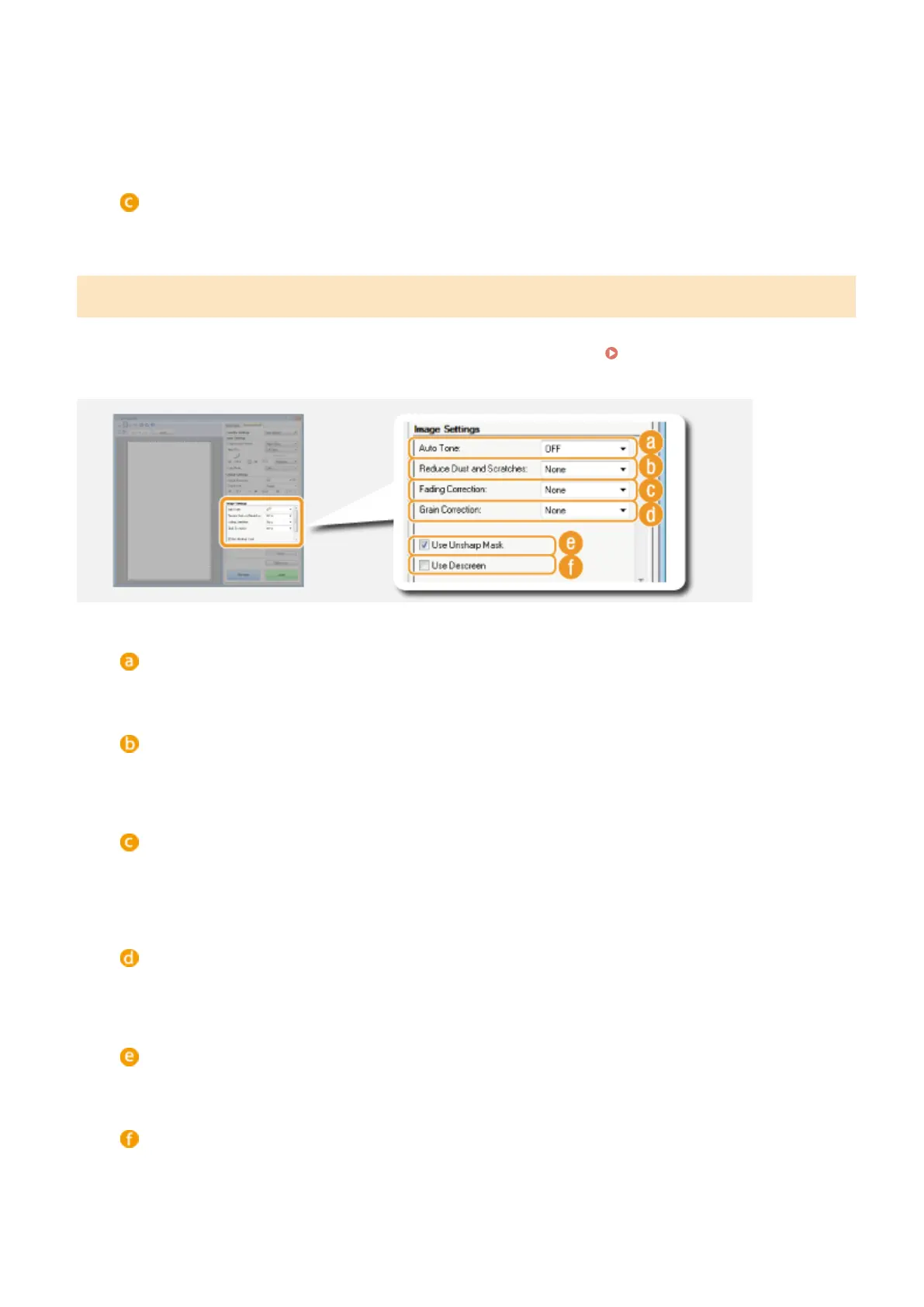Congure settings for improving the image quality, such as correction of scratches or faded colors on a photograph.