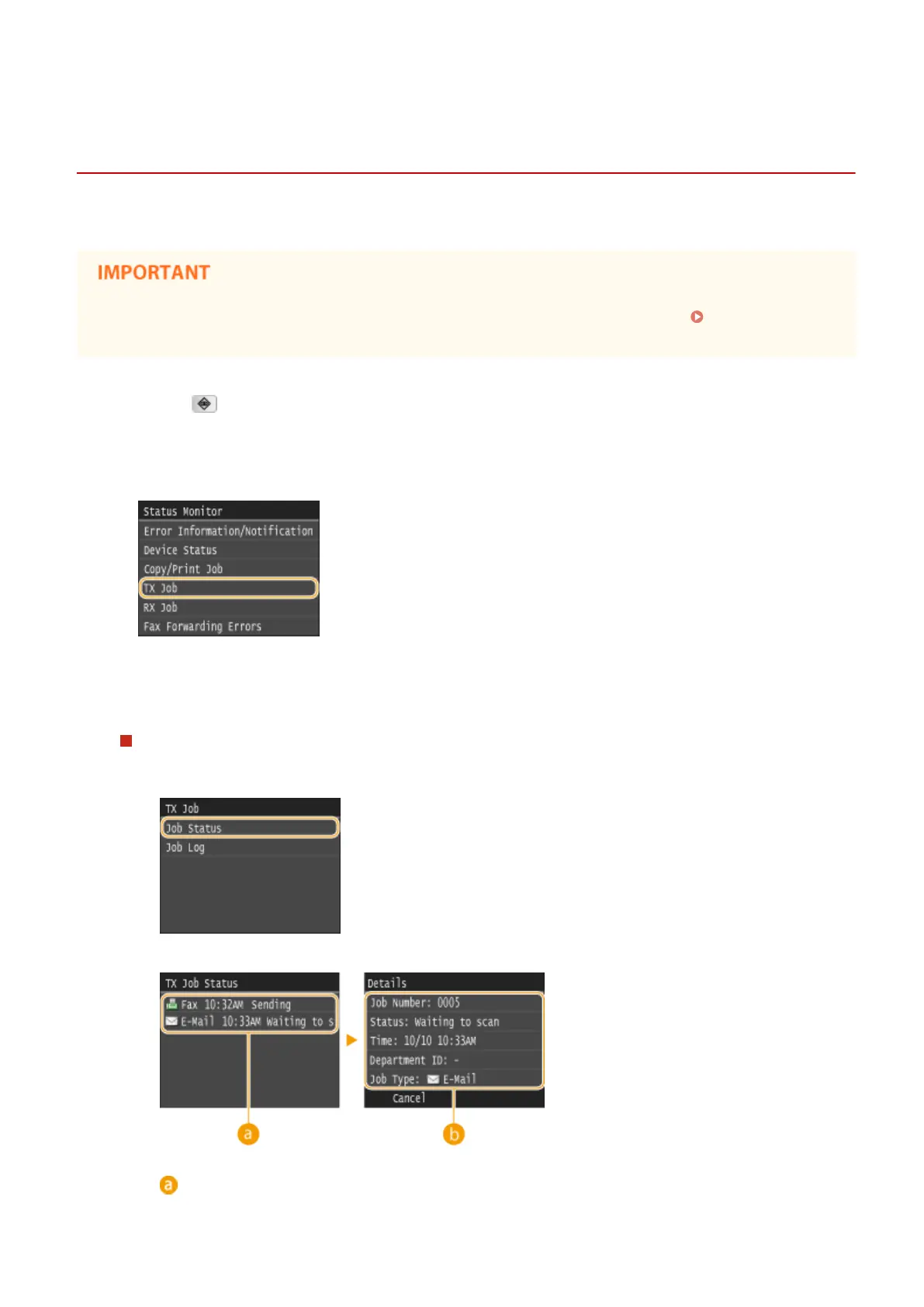 ● When <Display Job Log> is set to <Off>, you cannot check the logs for sent documents. Display Job