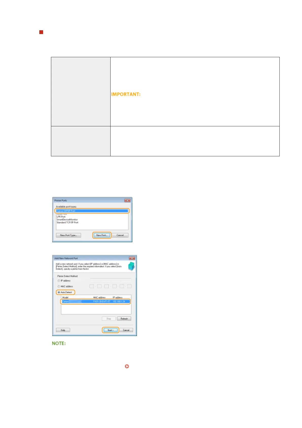 Select [Canon MFNP Port] in [Available port types] and click [New Port].