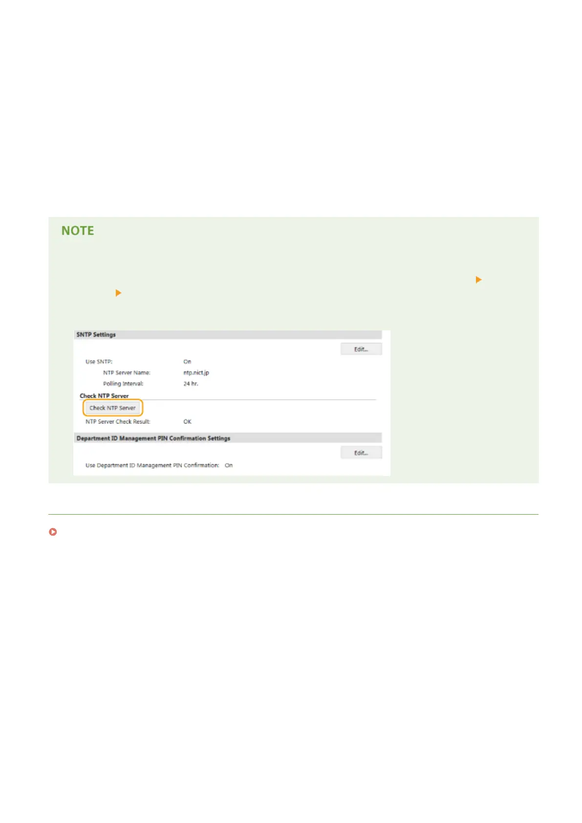 Settings] [TCP/IP Settings] and then clicking [Check NTP Server] in [SNTP Settings] that appears. If a