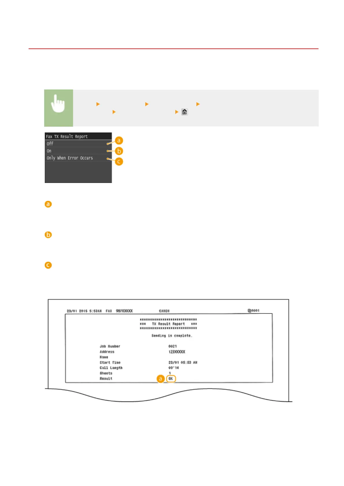 <Menu> <Output Report> <Report Settings> <Fax TX Result Report> or <E-Mail/I-Fax/File TX
