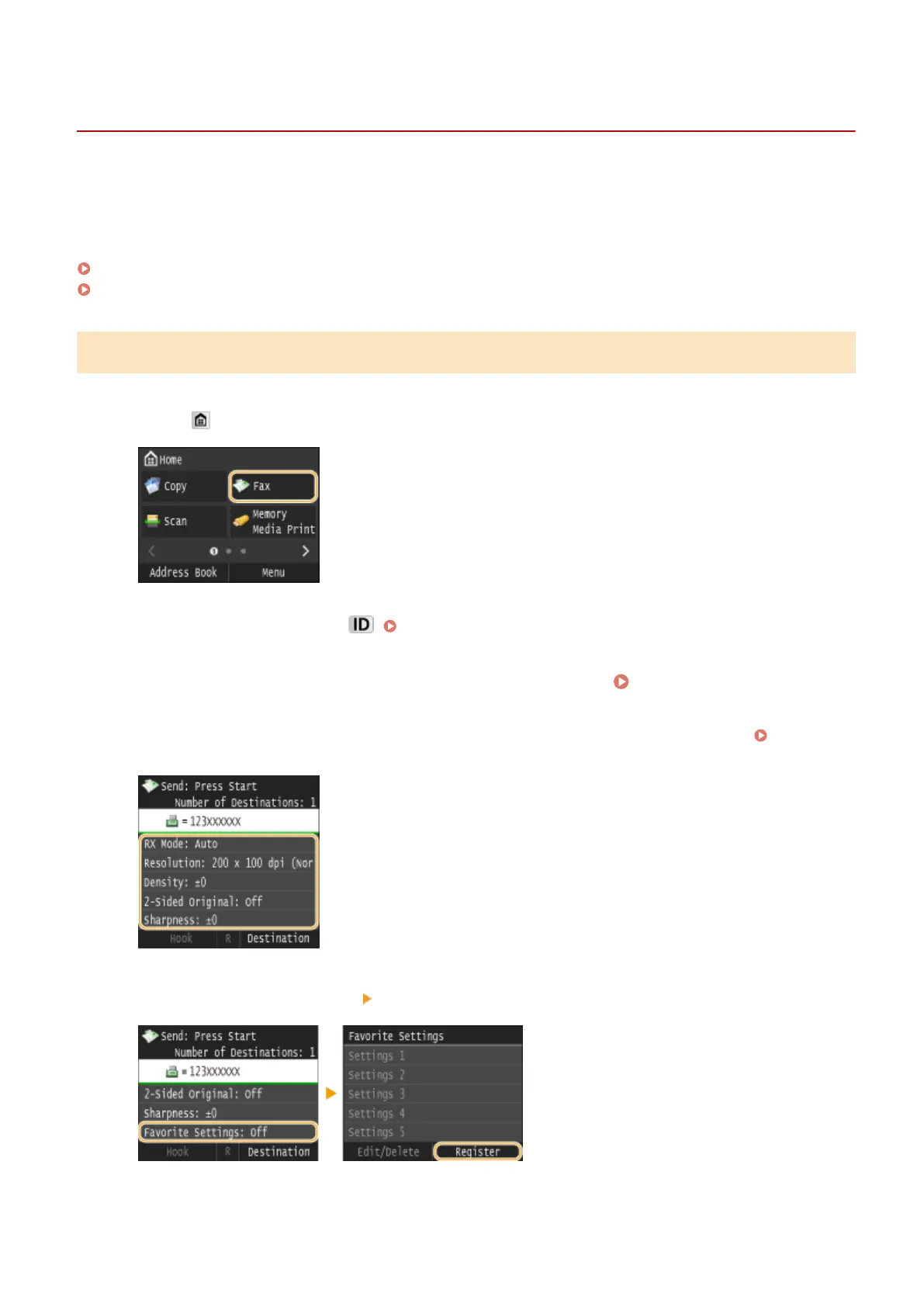 You can register up to 18 frequently used combinations of fax settings. You can quickly display registered settings
