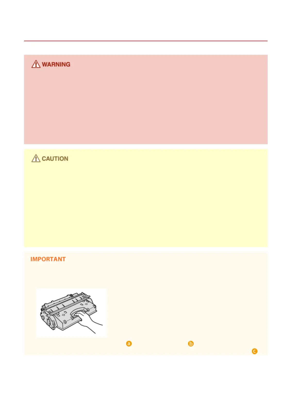 ● Use caution not to inhale any toner. If you should inhale toner, consult a physician immediately.