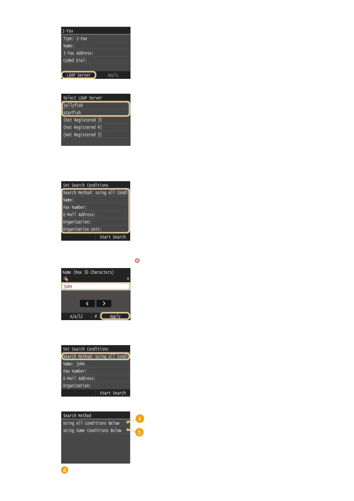 ● Name, fax numbers, e-mail addresses, organization names, and organization unit are available criteria