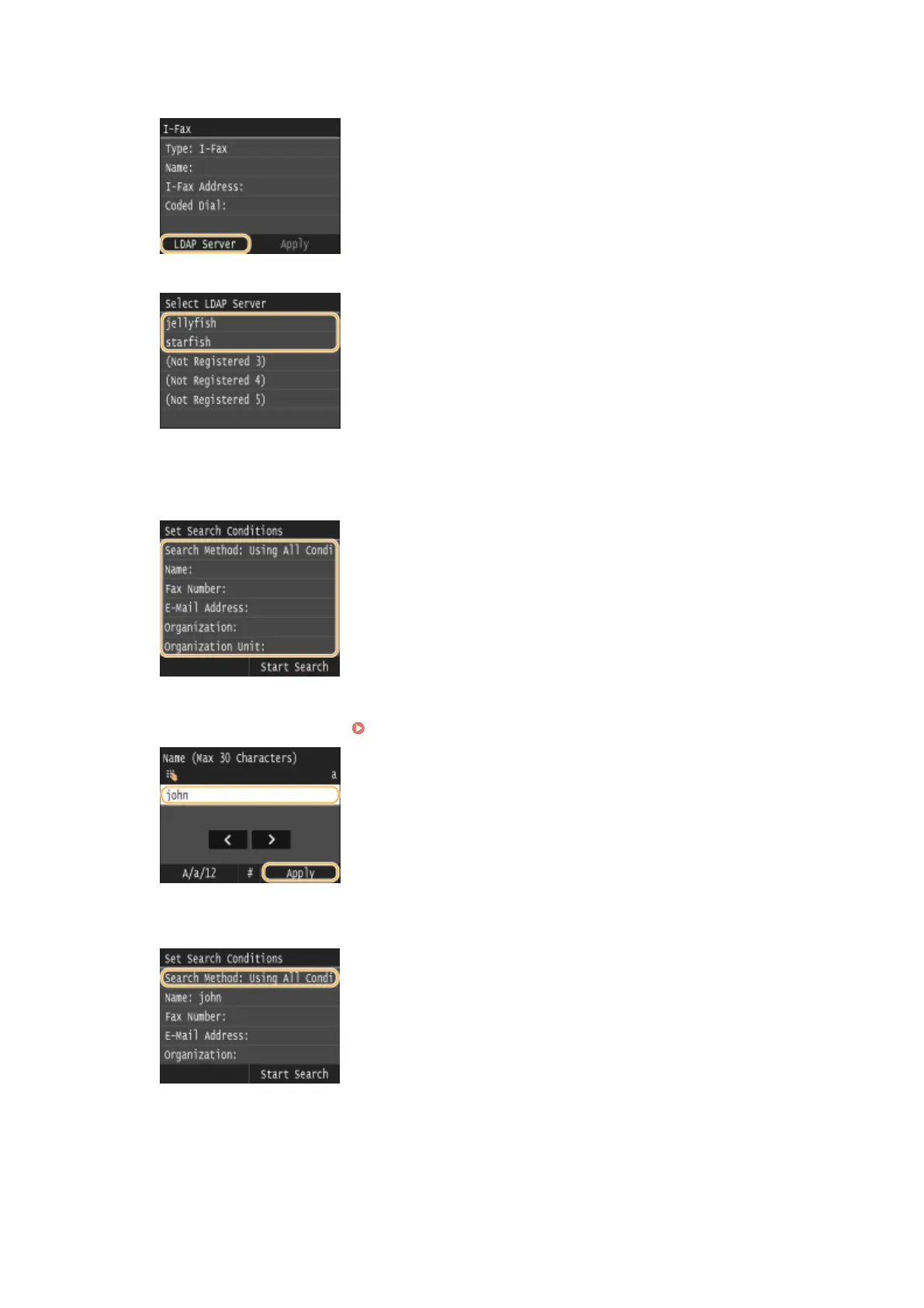 ● Name, fax numbers, e-mail addresses, organization names, and organization unit are available criteria