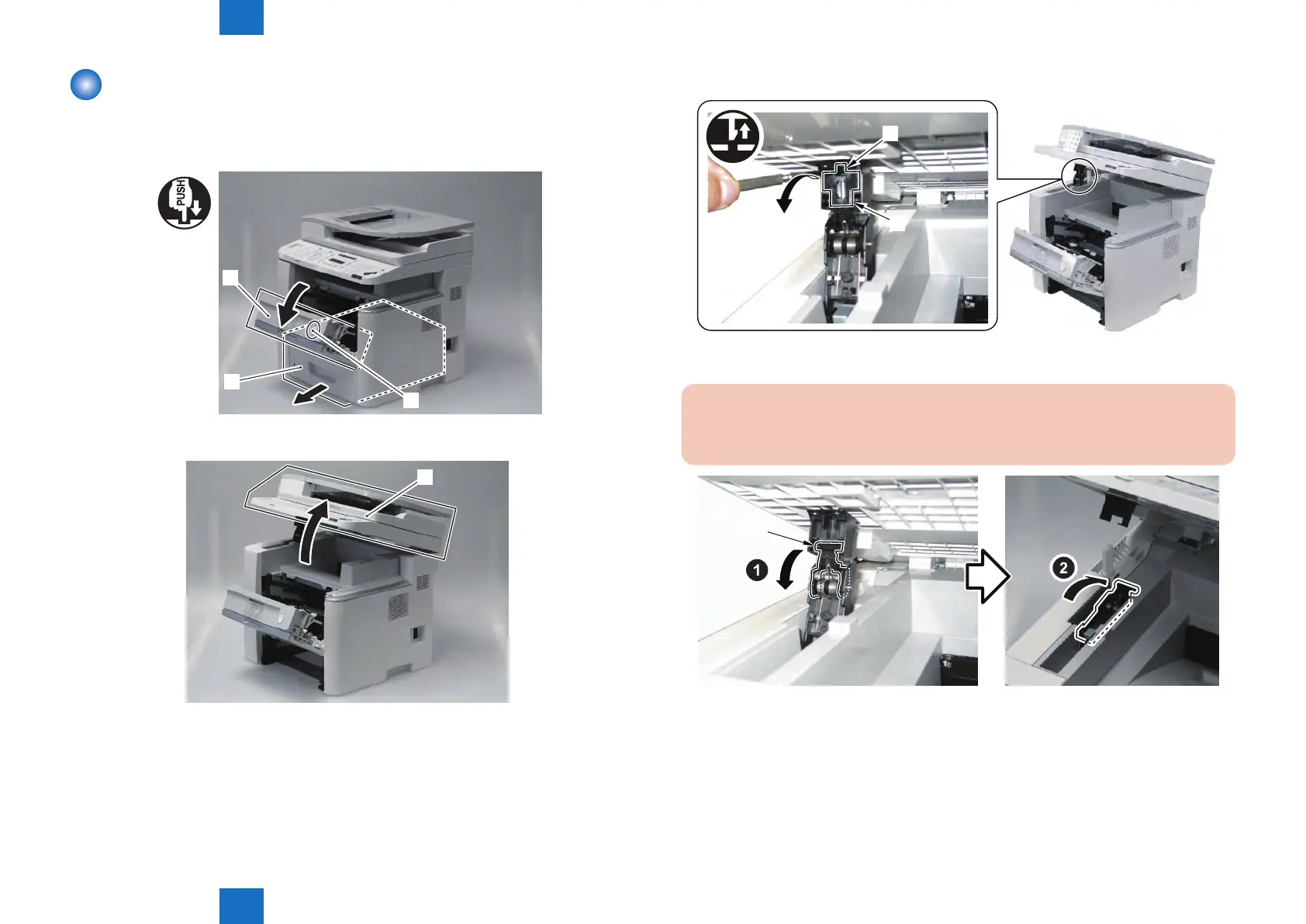 the work while supporting the ADF+Reader Unit. Be careful not to get your hand caught.