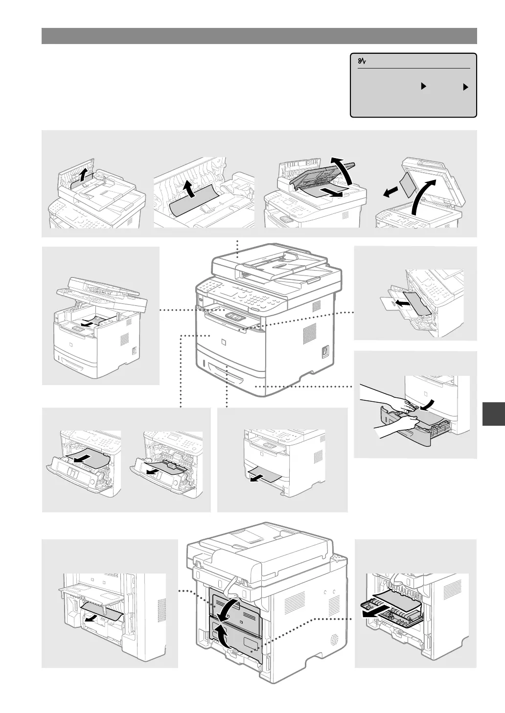 kuvatavad juhised. Selles juhendis näidatakse ainult alad, kus paberiummistus võib