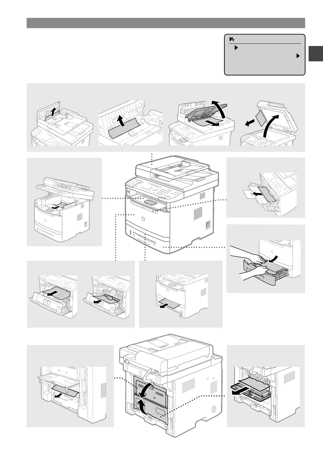 angezeigten Vorgehensweise, um das gestaute Dokument oder Papier zu entfernen.
