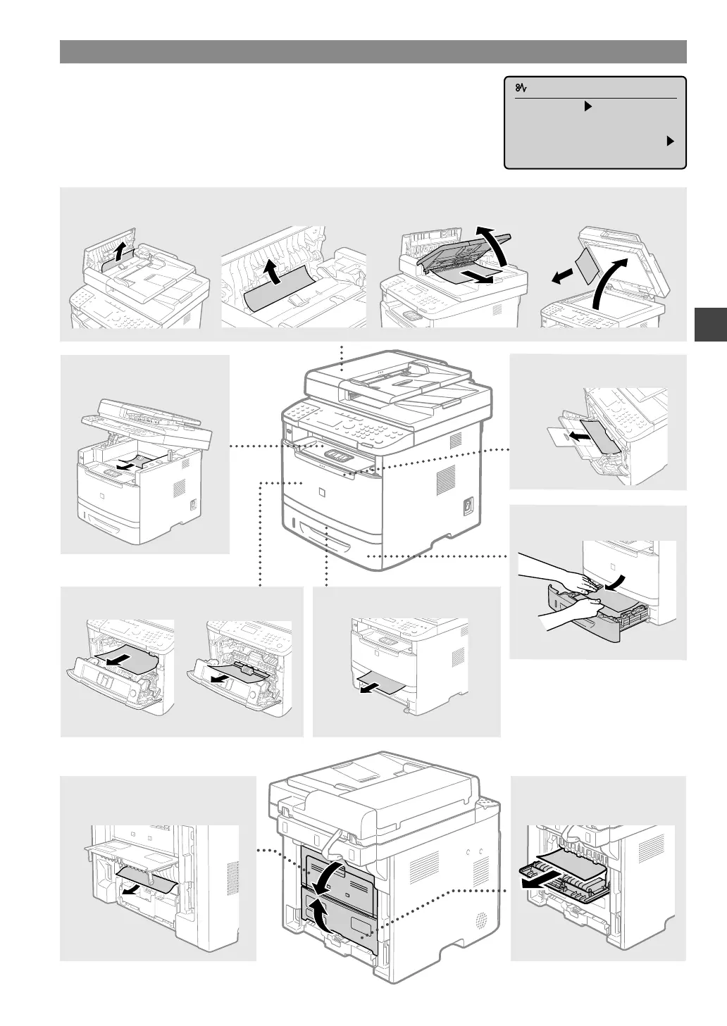 aangegeven op welke plaatsen papier kan vastlopen. Raadpleeg de e-Handleiding