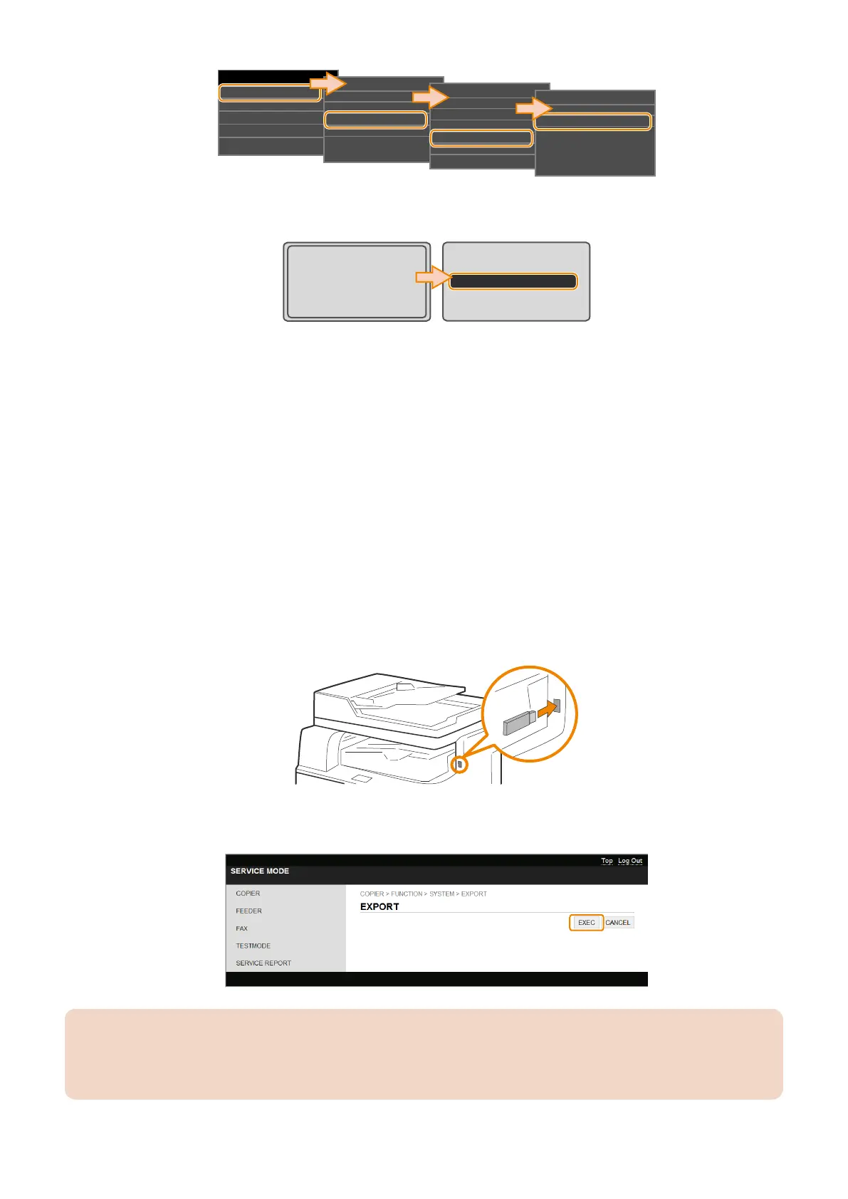 Access service mode (Remote UI), select COPIER > FUNCTION > SYSTEM > EXPORT, and click [EXEC].