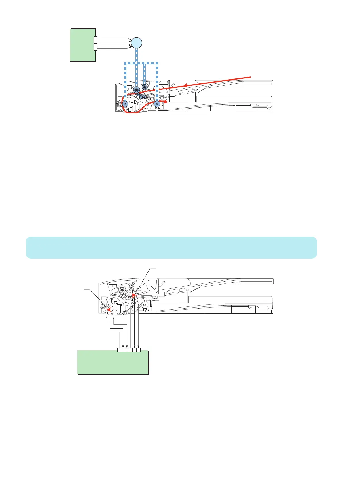 The leading edge of the original that is fed pushes up the actuator, activating the Document End Sensor (SR702) (light