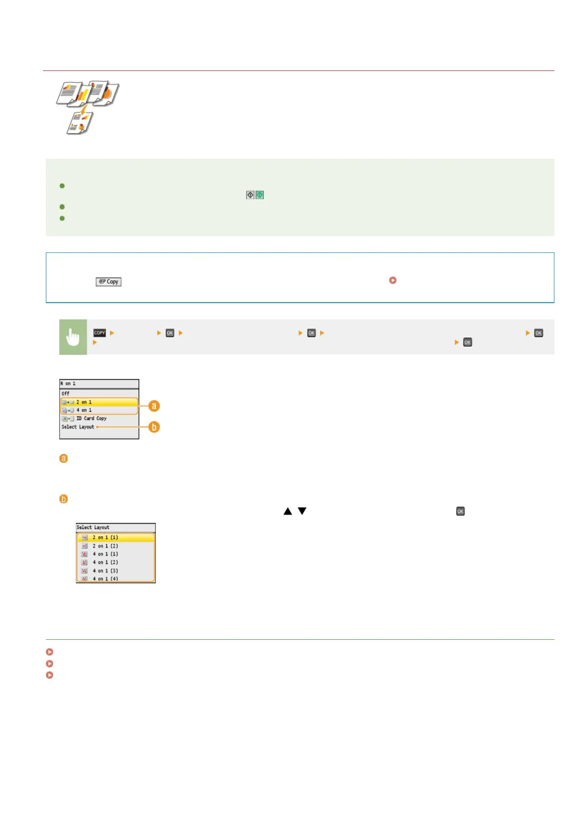 <2 on 1>/<4 on 1> is not available when using <Erase Frame>, <Paper Save Copy>, or <ID Card Copy>.